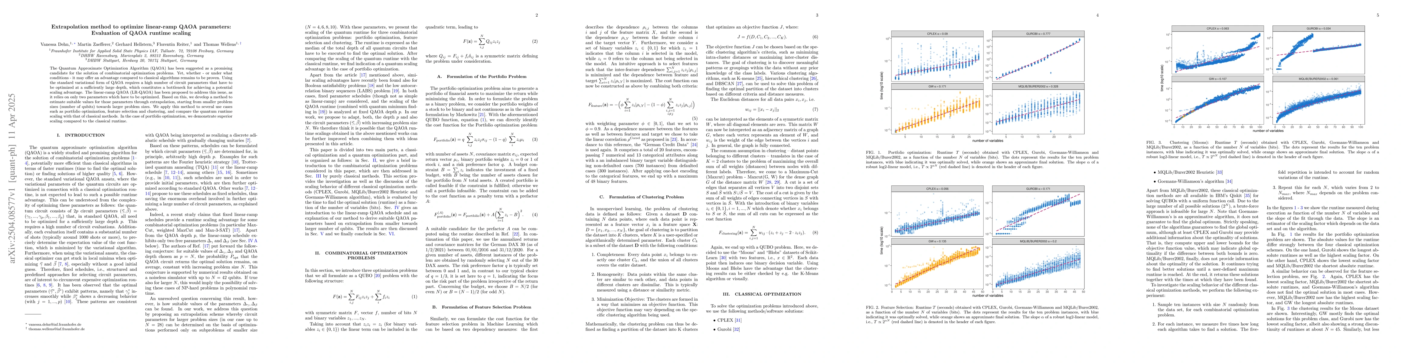 The paper presents an extrapolation method to optimize linear-ramp QAOA parameters, bypassing the need for classical optimization of circuit parameters. It investigates the runtime scaling of QAOA for three combinatorial optimization problems: Portfolio Optimization, Feature Selection, and Clustering, comparing it against classical methods.