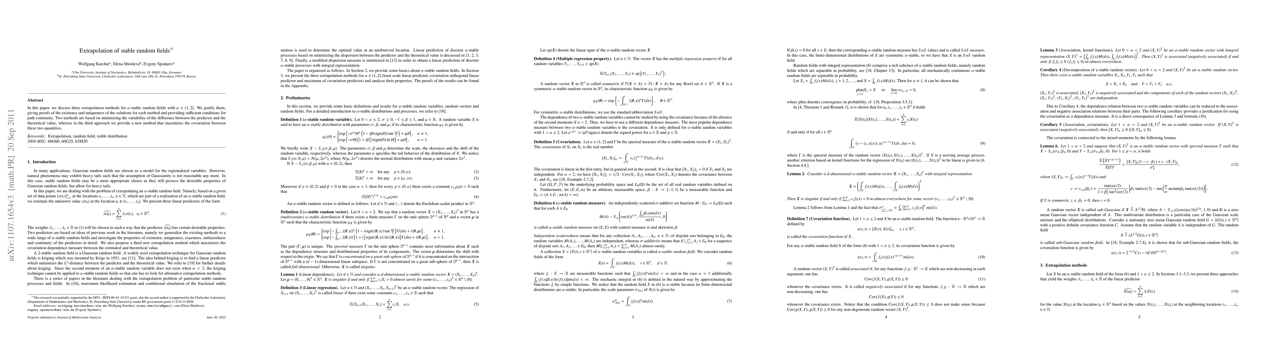 This paper explores three extrapolation methods for alpha-stable random fields (1 < alpha <= 2), proving the existence and uniqueness of solutions for each method and ensuring path continuity. Two methods minimize the difference variability, while the third maximizes the covariation between predictor and theoretical values.
