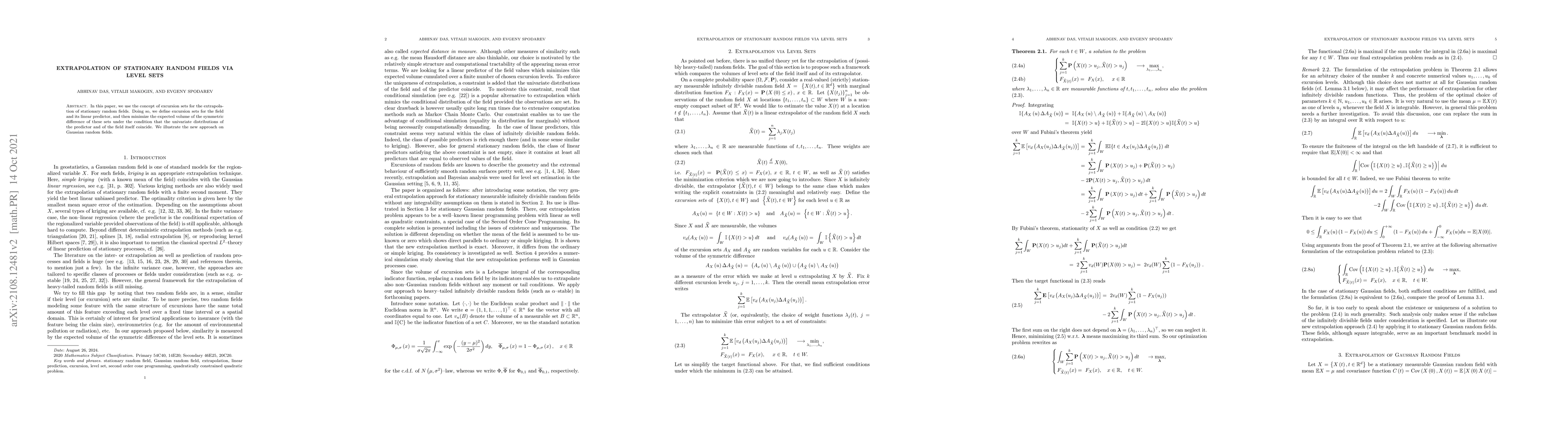This paper proposes an extrapolation method for stationary random fields using excursion sets, minimizing the expected volume of the symmetric difference between the field and its predictor's excursion sets while ensuring their univariate distributions match. The approach is demonstrated on Gaussian random fields.