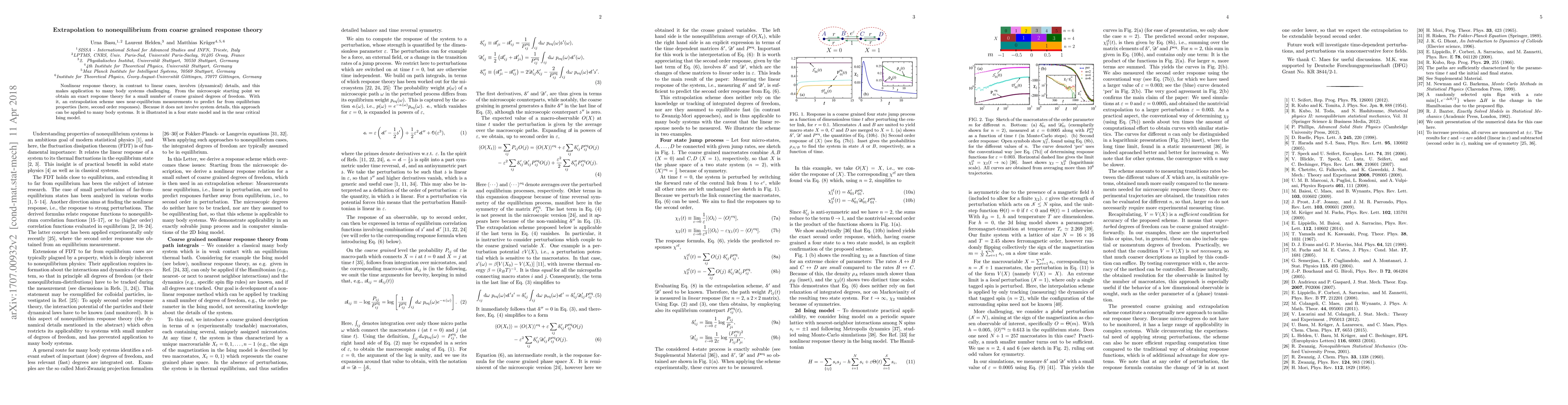Nonlinear response theory, in contrast to linear cases, involves (dynamical) details, and this makes application to many body systems challenging. From the microscopic starting point we obtain an exact response theory for a small number of coarse grained degrees of freedom. With it, an extrapolation scheme uses near-equilibrium measurements to predict far from equilibrium properties (here, second order responses). Because it does not involve system details, this approach can be applied to many body systems. It is illustrated in a four state model and in the near critical Ising model.