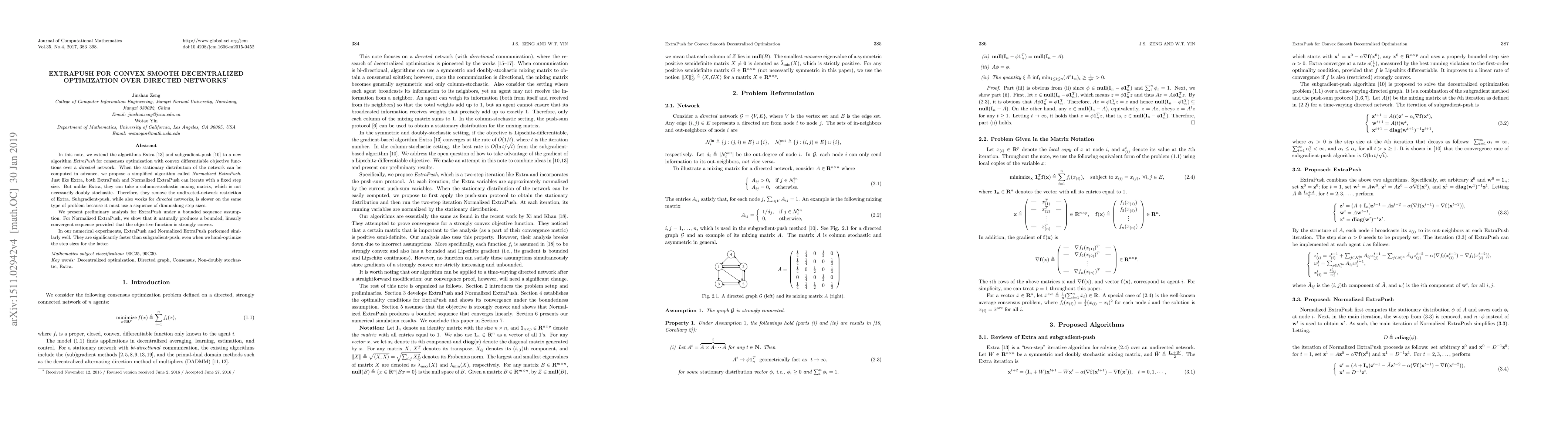 In this note, we extend the algorithms Extra and subgradient-push to a new algorithm ExtraPush for consensus optimization with convex differentiable objective functions over a directed network. When the stationary distribution of the network can be computed in advance}, we propose a simplified algorithm called Normalized ExtraPush. Just like Extra, both ExtraPush and Normalized ExtraPush can iterate with a fixed step size. But unlike Extra, they can take a column-stochastic mixing matrix, which is not necessarily doubly stochastic. Therefore, they remove the undirected-network restriction of Extra. Subgradient-push, while also works for directed networks, is slower on the same type of problem because it must use a sequence of diminishing step sizes. We present preliminary analysis for ExtraPush under a bounded sequence assumption. For Normalized ExtraPush, we show that it naturally produces a bounded, linearly convergent sequence provided that the objective function is strongly convex. In our numerical experiments, ExtraPush and Normalized ExtraPush performed similarly well. They are significantly faster than subgradient-push, even when we hand-optimize the step sizes for the latter.