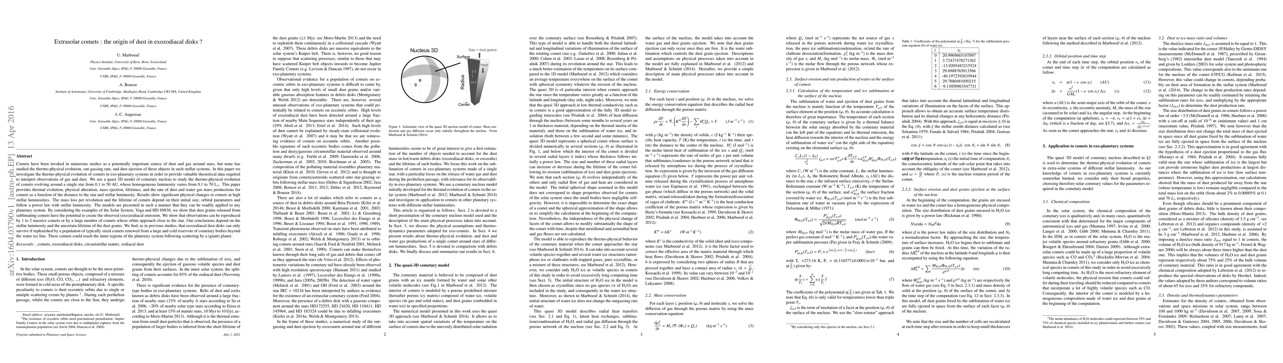Comets have been invoked in numerous studies as a potentially important source of dust and gas around stars, but none has studied the thermo-physical evolution, out-gassing rate, and dust ejection of these objects in such stellar systems. We investigate the thermo-physical evolution of comets in exo-planetary systems in order to provide valuable theoretical data required to interpret observations of gas and dust. We use a quasi 3D model of cometary nucleus to study the thermo-physical evolution of comets evolving around a single star from 0.1 to 50 AU, whose homogeneous luminosity varies from 0.1 to 70 solar luminosities. This paper provides mass ejection, lifetimes, and the rate of dust and water gas mass productions for comets as a function of the distance to the star and stellar luminosity. Results show significant physical changes to comets at high stellar luminosities. The models are presented in such a manner that they can be readily applied to any planetary system. By considering the examples of the Solar System, Vega and HD 69830, we show that dust grains released from sublimating comets have the potential to create the observed (exo)zodiacal emission. We show that observations can be reproduced by 1 to 2 massive comets or by a large number of comets whose orbits approach close to the star. Our conclusions depend on the stellar luminosity and the uncertain lifetime of the dust grains. We find, as in previous studies, that exozodiacal dust disks can only survive if replenished by a population of typically sized comets renewed from a large and cold reservoir of cometary bodies beyond the water ice line. These comets could reach the inner regions of the planetary system following scattering by a (giant) planet.