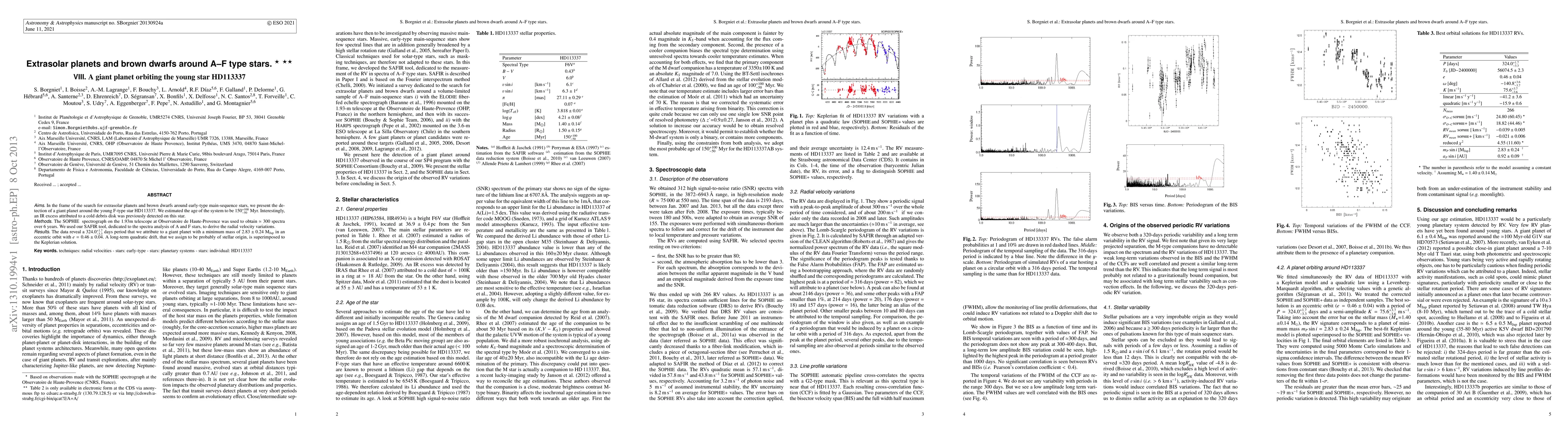 This paper reports the detection of a giant planet orbiting the young F-type star HD113337, estimated to be 150 Myr old. The planet, with a minimum mass of 2.83 Mjup, has an eccentric orbit and a period of 324 days, discovered using the SOPHIE spectrograph.