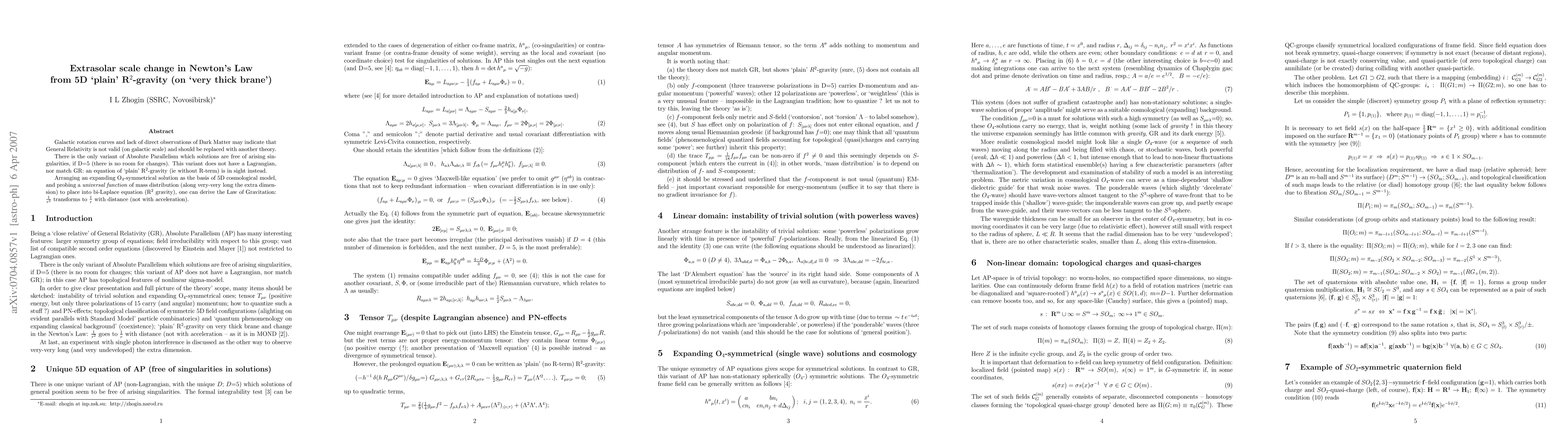 Galactic rotation curves and lack of direct observations of Dark Matter may indicate that General Relativity is not valid (on galactic scale) and should be replaced with another theory. There is the only variant of Absolute Parallelism which solutions are free of arising singularities, if D=5 (there is no room for changes). This variant does not have a Lagrangian, nor match GR: an equation of `plain' R^2-gravity (ie without R-term) is in sight instead. Arranging an expanding O_4-symmetrical solution as the basis of 5D cosmological model, and probing a universal_function of mass distribution (along very-very long the extra dimension) to place into bi-Laplace equation (R^2 gravity), one can derive the Law of Gravitation: 1/r^2 transforms to 1/r with distance (not with acceleration).