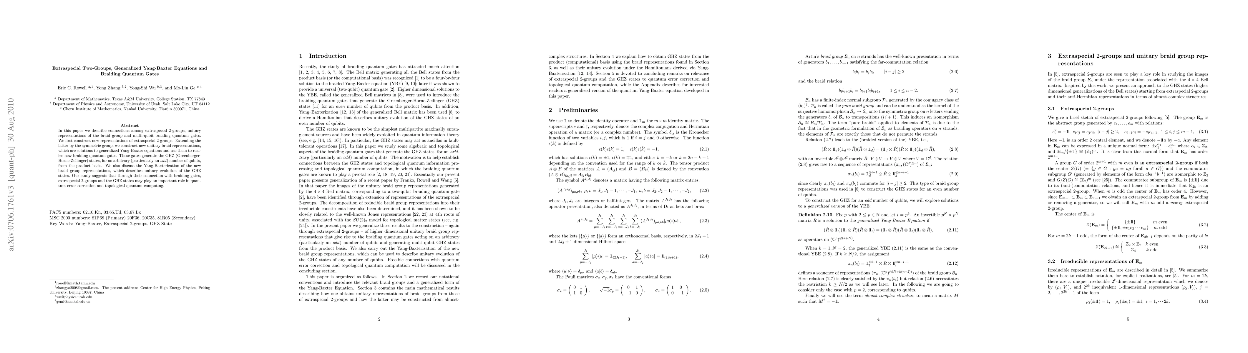 This paper explores the relationship between extraspecial 2-groups, unitary braid representations, and multi-qubit braiding quantum gates. It constructs new representations that solve generalized Yang-Baxter equations, leading to braiding gates generating GHZ states, which have implications for quantum error correction and topological quantum computing.
