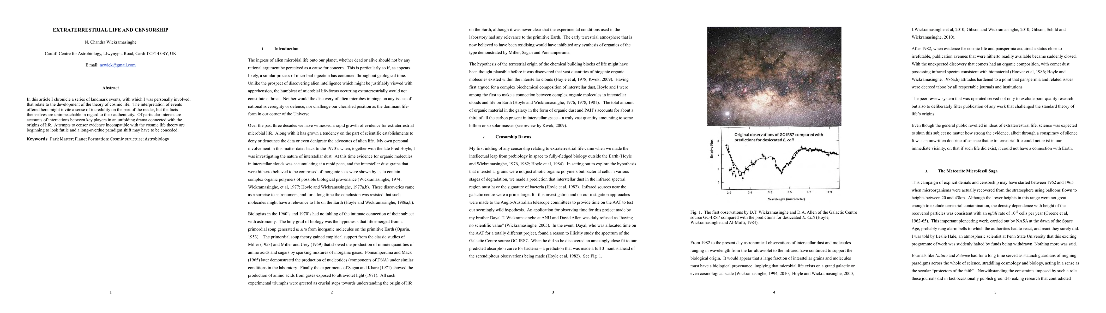 This paper chronicles personal events involved in developing the cosmic life theory, revealing attempts to censor evidence that may lead to a paradigm shift. It explores interactions related to the origins of life and challenges conventional views on extraterrestrial life.