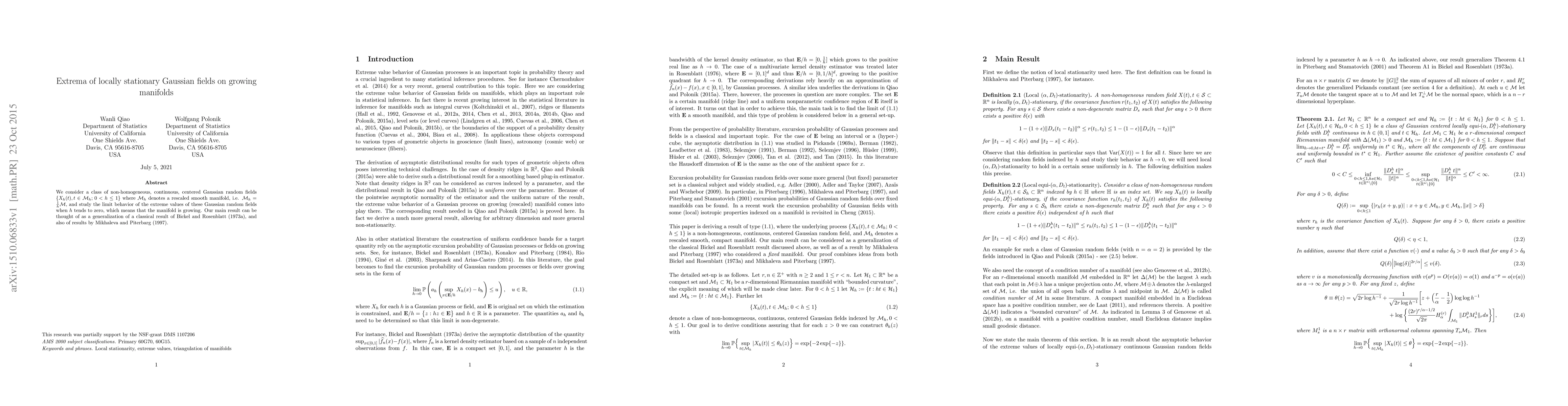 We consider a class of non-homogeneous, continuous, centered Gaussian random fields $\{X_h(t), t \in {\cal M}_h;\,0 < h \le 1\}$ where ${\cal M}_h$ denotes a rescaled smooth manifold, i.e. ${\cal M}_h = \frac{1}{h} {\cal M},$ and study the limit behavior of the extreme values of these Gaussian random fields when $h$ tends to zero, which means that the manifold is growing. Our main result can be thought of as a generalization of a classical result of Bickel and Rosenblatt (1973a), and also of results by Mikhaleva and Piterbarg (1997).