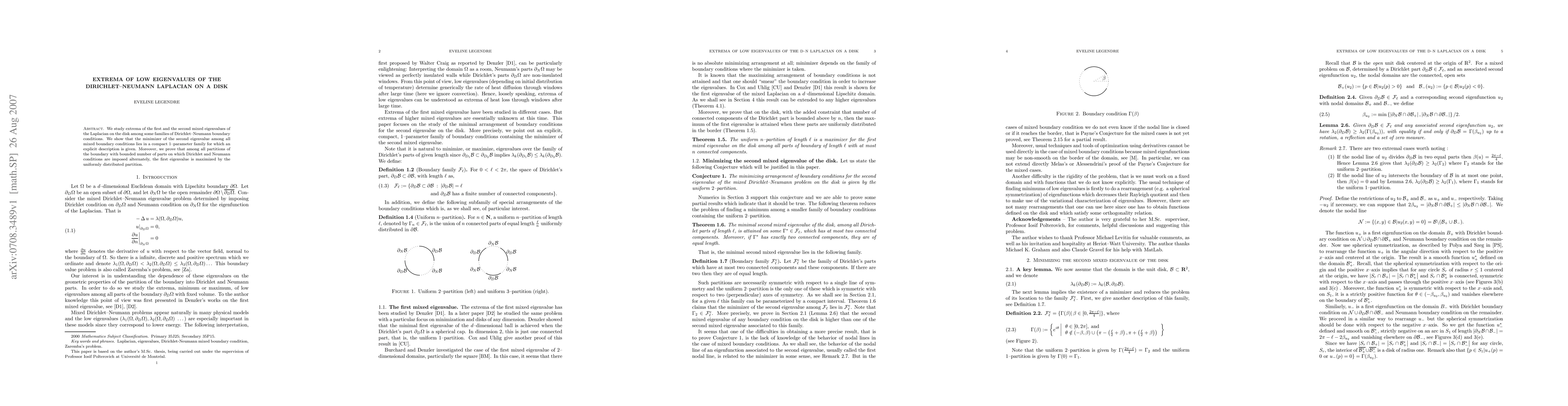 This paper investigates the extrema of the first and second mixed eigenvalues of the Laplacian on a disk under various Dirichlet-Neumann boundary conditions. It finds that the second eigenvalue's minimizer occurs within a specified compact family, while the first eigenvalue is maximized by a uniformly distributed partition of the boundary.