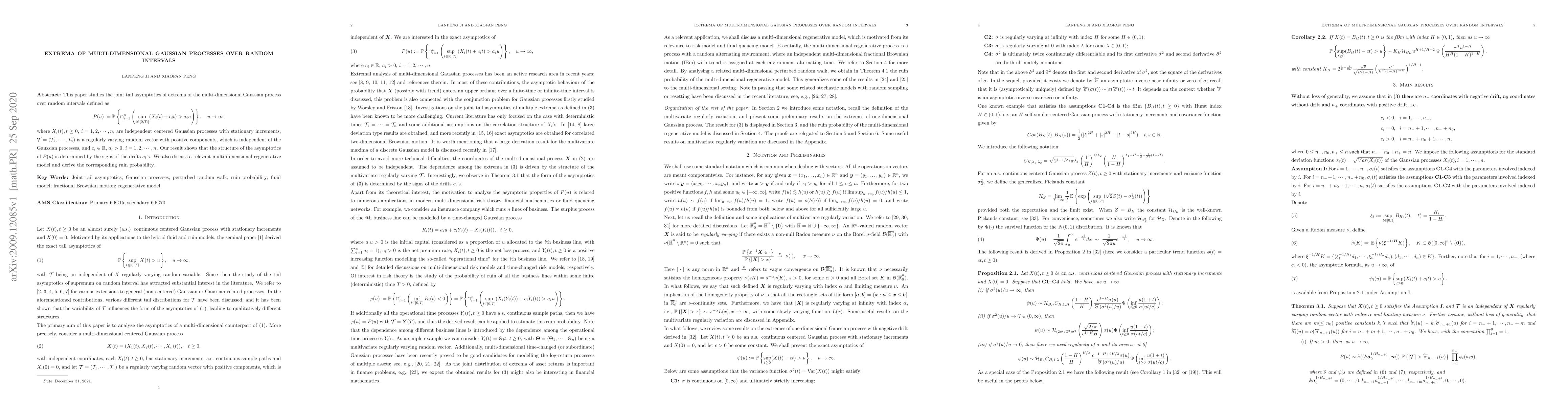 This paper investigates the joint tail asymptotics of extrema for multi-dimensional Gaussian processes over random intervals, revealing that the asymptotic behavior of the probabilities depends on the signs of the drifts. It also explores a related multi-dimensional regenerative model and derives the corresponding ruin probability.