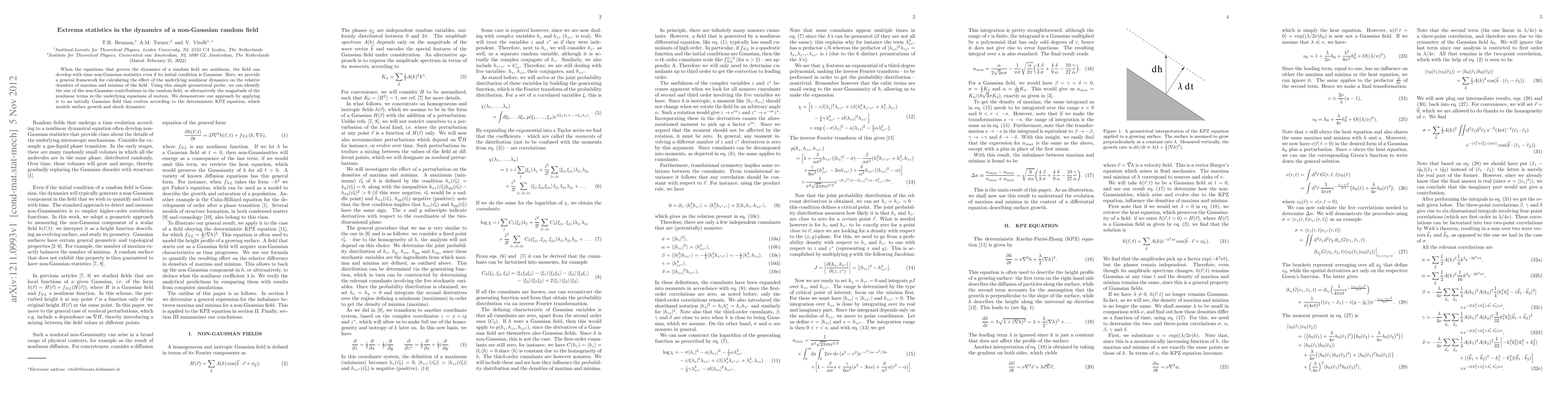 When the equations that govern the dynamics of a random field are nonlinear, the field can develop with time non-Gaussian statistics even if its initial condition is Gaussian. Here, we provide a general framework for calculating the effect of the underlying nonlinear dynamics on the relative densities of maxima and minima of the field. Using this simple geometrical probe, we can identify the size of the non-Gaussian contributions in the random field, or alternatively the magnitude of the nonlinear terms in the underlying equations of motion. We demonstrate our approach by applying it to an initially Gaussian field that evolves according to the deterministic KPZ equation, which models surface growth and shock dynamics.