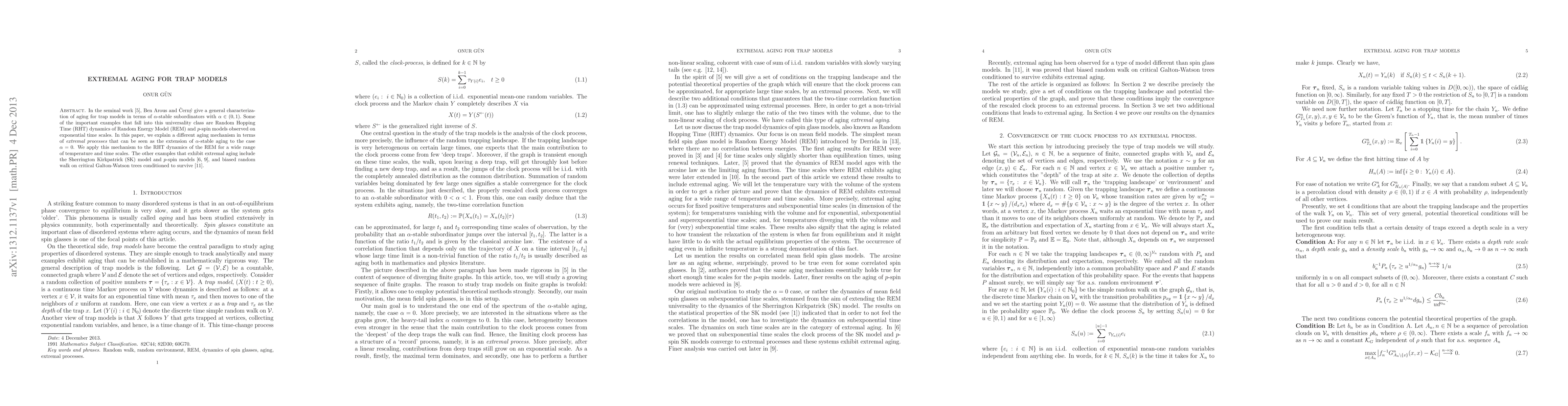 This paper introduces a novel aging mechanism termed "extremal aging," extending the concept of $\alpha$-stable aging to $\alpha=0$, and applies it to the Random Hopping Time dynamics of the Random Energy Model across various temperature and time scales. It also identifies the Sherrington Kirkpatrick model and $p$-spin models as examples exhibiting this new aging type.