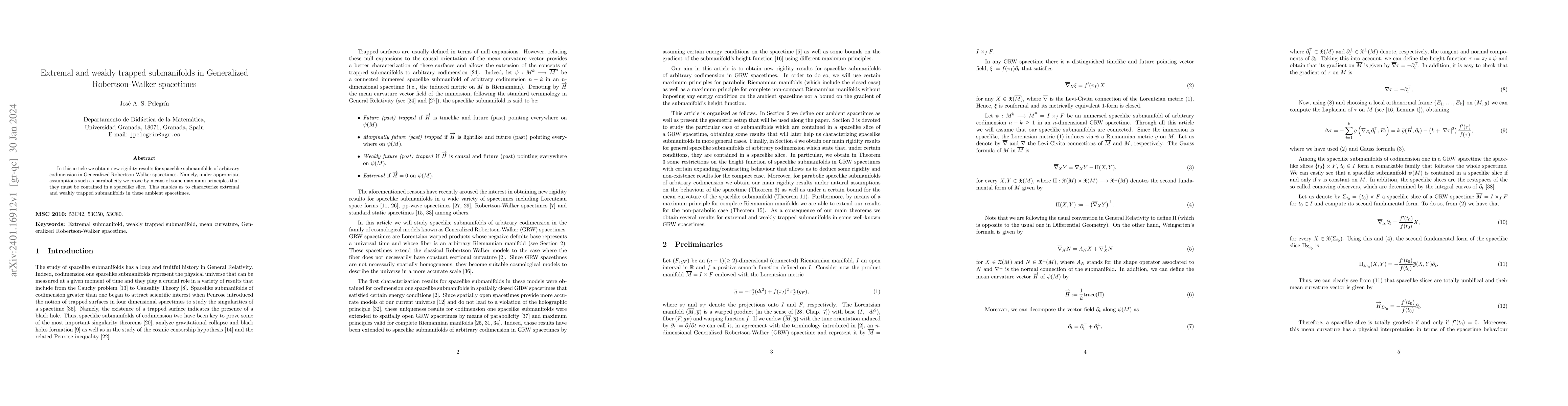 This paper establishes new rigidity results for spacelike submanifolds in Generalized Robertson-Walker spacetimes, proving that under certain conditions like parabolicity, these submanifolds are contained within a spacelike slice, thereby characterizing extremal and weakly trapped submanifolds.