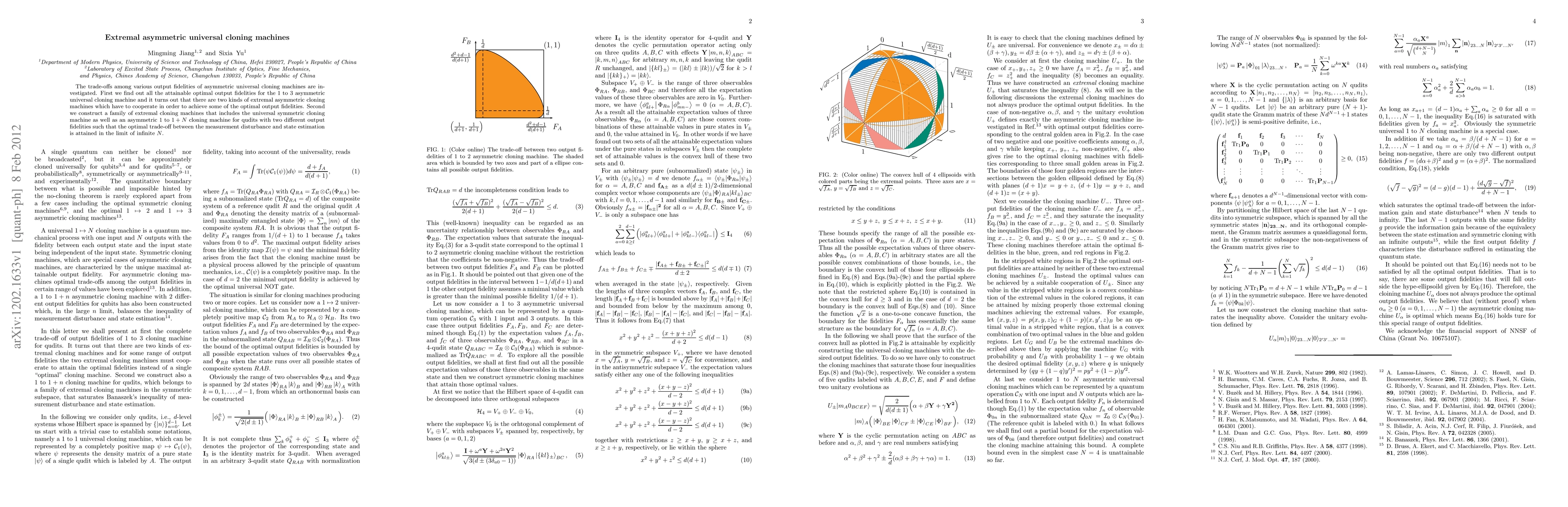 This paper investigates optimal output fidelities for asymmetric universal cloning machines, identifying two types of extremal machines that must cooperate to achieve certain optimal fidelities. It constructs a family of extremal cloning machines, including a universal symmetric machine and asymmetric 1 to $1+N$ machines, which optimize the trade-off between measurement disturbance and state estimation as $N$ approaches infinity.