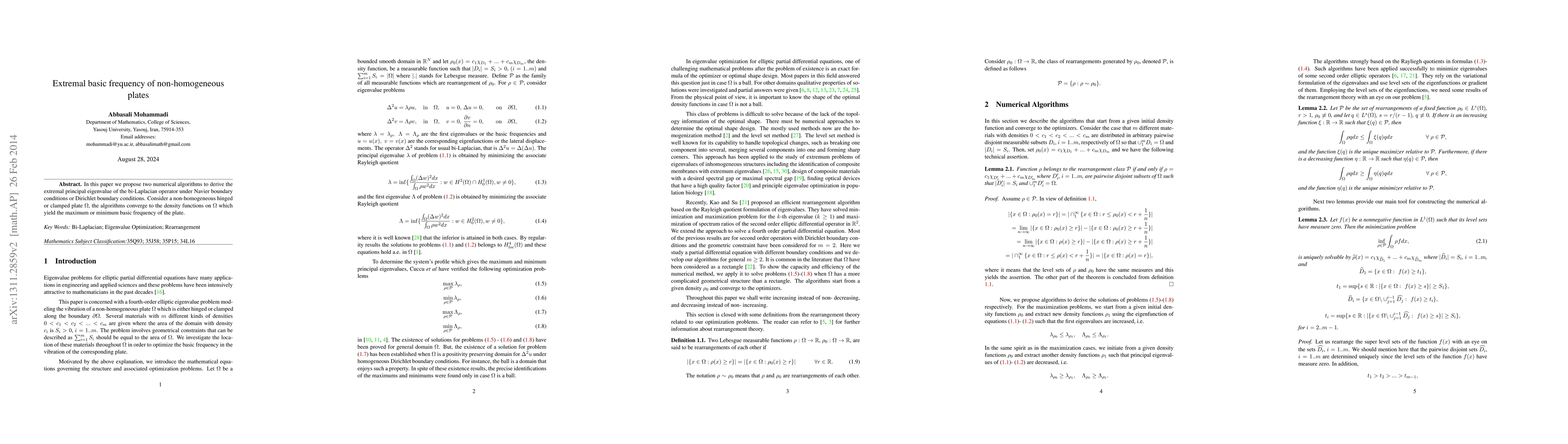 In this paper we propose two numerical algorithms to derive the extremal principal eigenvalue of the bi-Laplacian operator under Navier boundary conditions or Dirichlet boundary conditions. Consider a non-homogeneous hinged or clamped plate $\Omega$, the algorithms converge to the density functions on $\Omega$ which they yield the maximum or minimum basic frequency of the plate.
