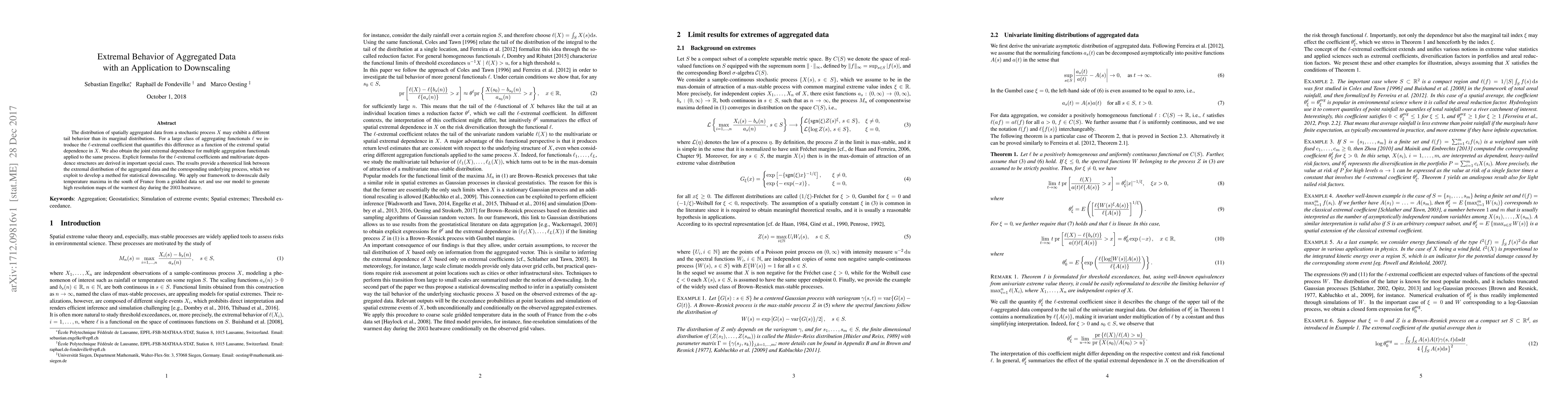 The distribution of spatially aggregated data from a stochastic process $X$ may exhibit a different tail behavior than its marginal distributions. For a large class of aggregating functionals $\ell$ we introduce the $\ell$-extremal coefficient that quantifies this difference as a function of the extremal spatial dependence in $X$. We also obtain the joint extremal dependence for multiple aggregation functionals applied to the same process. Explicit formulas for the $\ell$-extremal coefficients and multivariate dependence structures are derived in important special cases. The results provide a theoretical link between the extremal distribution of the aggregated data and the corresponding underlying process, which we exploit to develop a method for statistical downscaling. We apply our framework to downscale daily temperature maxima in the south of France from a gridded data set and use our model to generate high resolution maps of the warmest day during the 2003 heatwave.