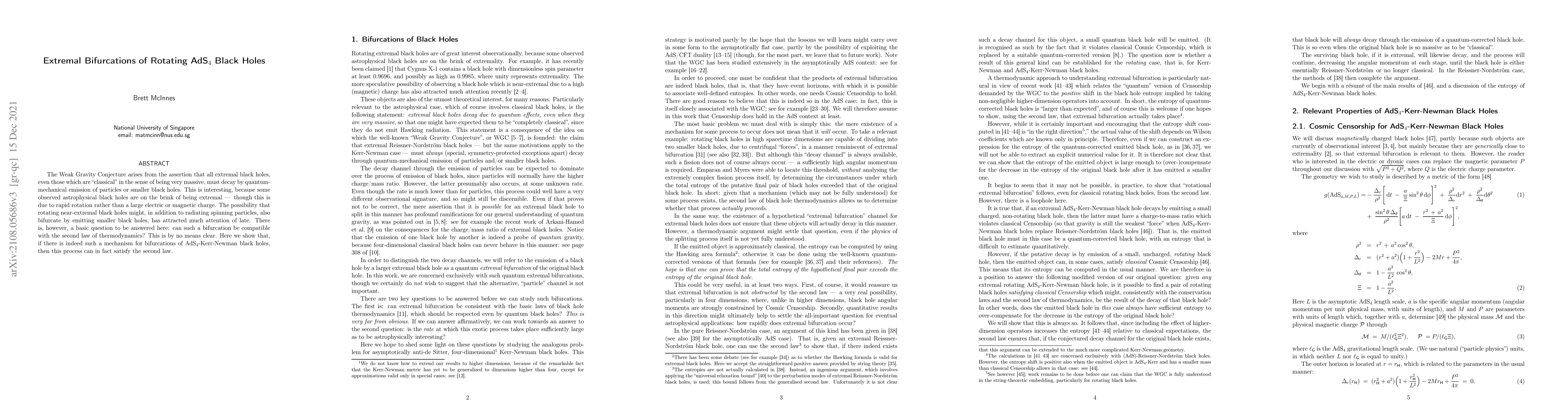 The Weak Gravity Conjecture arises from the assertion that all extremal black holes, even those which are "classical" in the sense of being very massive, must decay by quantum-mechanical emission of particles or smaller black holes. This is interesting, because some observed astrophysical black holes are on the brink of being extremal -- $\,$ though this is due to rapid rotation rather than a large electric or magnetic charge. The possibility that rotating near-extremal black holes might, in addition to radiating spinning particles, also bifurcate by emitting smaller black holes, has attracted much attention of late. There is, however, a basic question to be answered here: can such a bifurcation be compatible with the second law of thermodynamics? This is by no means clear. Here we show that, if there is indeed such a mechanism for bifurcations of AdS$_4$-Kerr-Newman black holes, then this process can in fact satisfy the second law.
