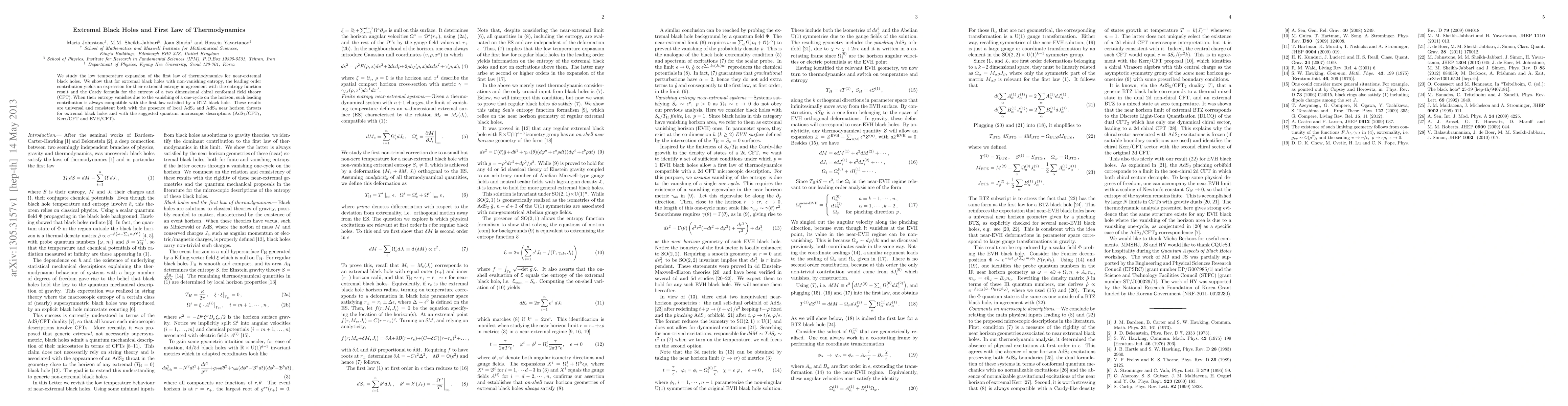 We study the low temperature expansion of the first law of thermodynamics for near-extremal black holes. We show that for extremal black holes with non-vanishing entropy, the leading order contribution yields an expression for their extremal entropy in agreement with the entropy function result and the Cardy formula for the entropy of a two dimensional chiral conformal field theory (CFT). When their entropy vanishes due to the vanishing of a one-cycle on the horizon, such leading contribution is always compatible with the first law satisfied by a BTZ black hole. These results are universal and consistent both with the presence of local AdS2 and AdS3 near horizon throats for extremal black holes and with the suggested quantum microscopic descriptions (AdS2/CFT1, Kerr/CFT and EVH/CFT).