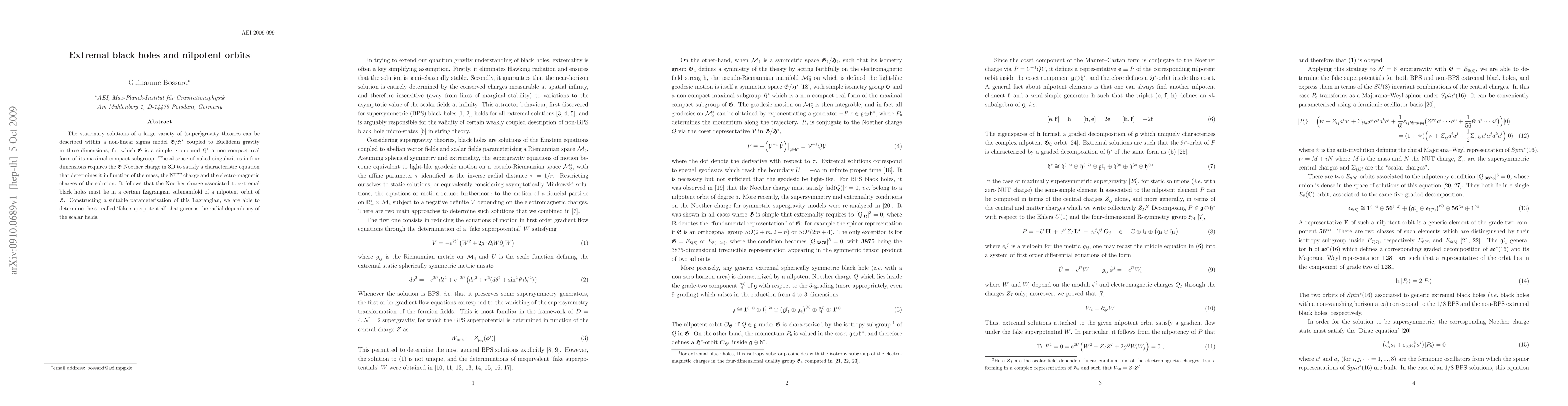 The stationary solutions of a large variety of (super)gravity theories can be described within a non-linear sigma model G / H* coupled to Euclidean gravity in three-dimensions, for which G is a simple group and H* a non-compact real form of its maximal compact subgroup. The absence of naked singularities in four dimensions requires the G Noether charge in 3D to satisfy a characteristic equation that determines it in function of the mass, the NUT charge and the electro-magnetic charges of the solution. It follows that the Noether charge associated to extremal black holes must lie in a certain Lagrangian submanifold of a nilpotent orbit of G. Constructing a suitable parameterisation of this Lagrangian, we are able to determine the so-called `fake superpotential' that governs the radial dependency of the scalar fields.