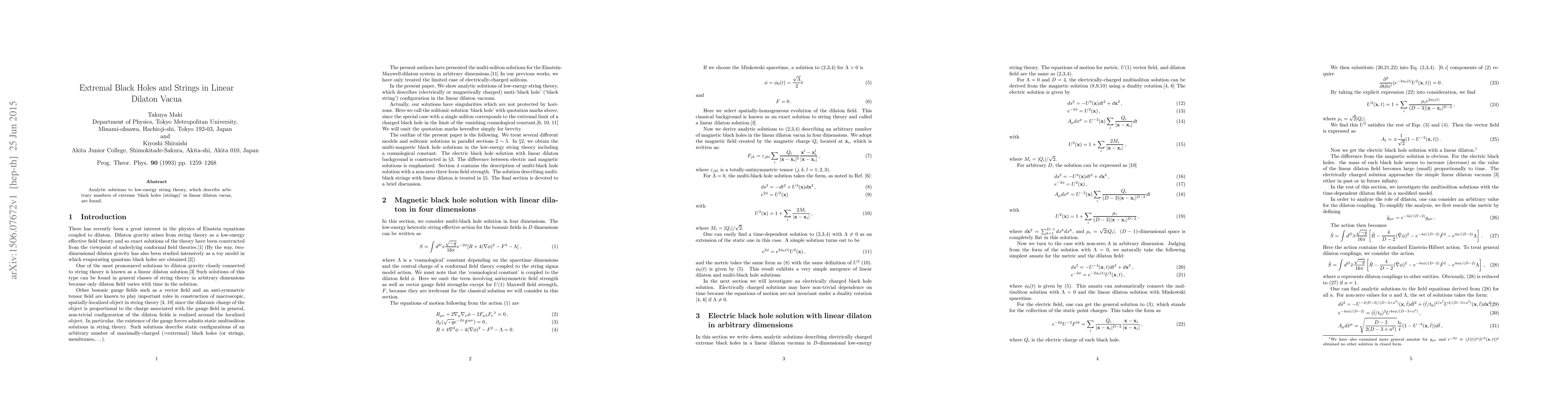 Analytic solutions to low-energy string theory, which describe arbitrary numbers of extreme `black holes (strings)' in linear dilaton vacua, are found.