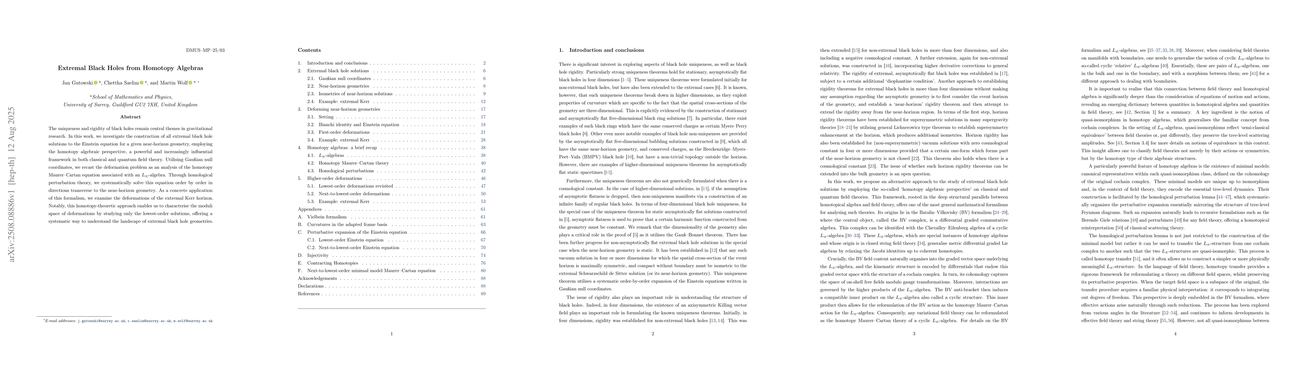 The uniqueness and rigidity of black holes remain central themes in gravitational research. In this work, we investigate the construction of all extremal black hole solutions to the Einstein equation for a given near-horizon geometry, employing the homotopy algebraic perspective, a powerful and increasingly influential framework in both classical and quantum field theory. Utilising Gau{\ss}ian null coordinates, we recast the deformation problem as an analysis of the homotopy Maurer-Cartan equation associated with an $L_\infty$-algebra. Through homological perturbation theory, we systematically solve this equation order by order in directions transverse to the near-horizon geometry. As a concrete application of this formalism, we examine the deformations of the extremal Kerr horizon. Notably, this homotopy-theoretic approach enables us to characterise the moduli space of deformations by studying only the lowest-order solutions, offering a systematic way to understand the landscape of extremal black hole geometries.