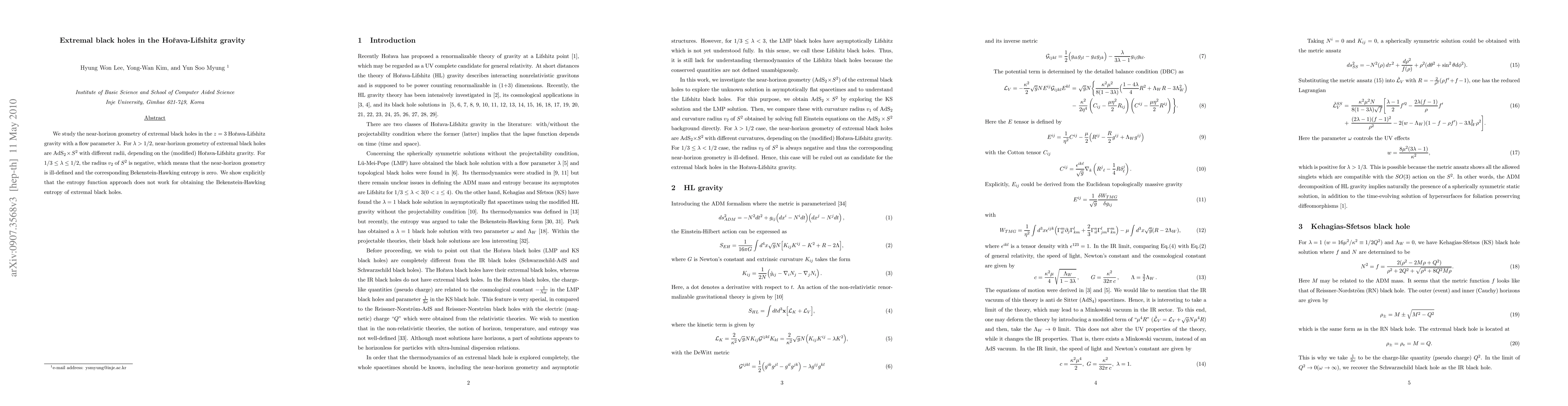 We study the near-horizon geometry of extremal black holes in the $z=3$ Ho\v{r}ava-Lifshitz gravity with a flow parameter $\lambda$. For $\lambda>1/2$, near-horizon geometry of extremal black holes are AdS$_2 \times S^2$ with different radii, depending on the (modified) Ho\v{r}ava-Lifshitz gravity. For $1/3\le \lambda \le 1/2$, the radius $v_2$ of $S^2$ is negative, which means that the near-horizon geometry is ill-defined and the corresponding Bekenstein-Hawking entropy is zero. We show explicitly that the entropy function approach does not work for obtaining the Bekenstein-Hawking entropy of extremal black holes.