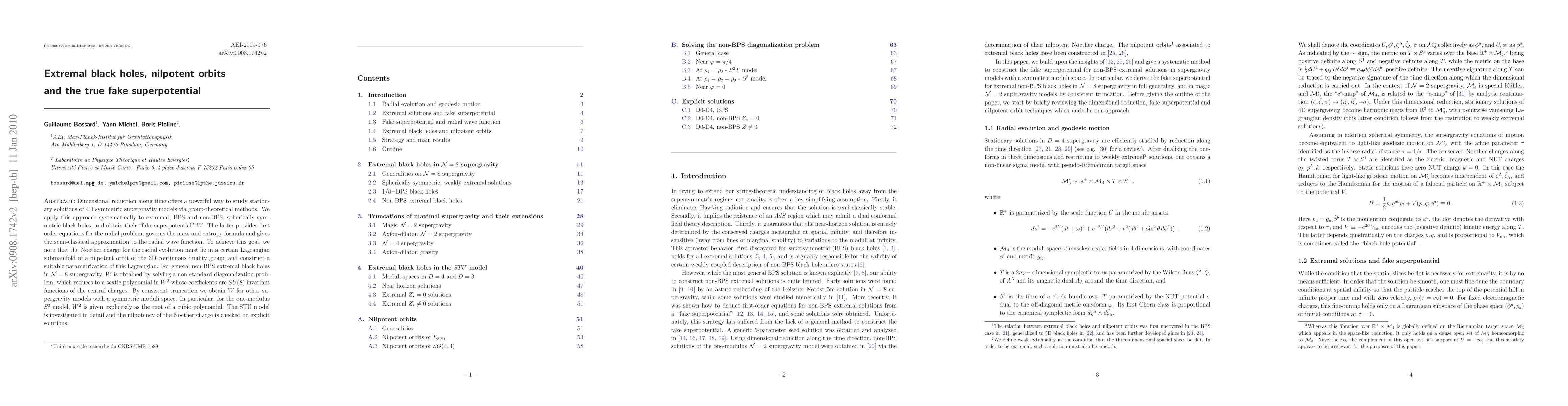 This paper explores the application of dimensional reduction to study extremal black holes in symmetric supergravity models, deriving a "fake superpotential" W that governs mass, entropy, and wave functions. The Noether charge is linked to nilpotent orbits within the 3D continuous duality group, leading to explicit solutions for W in various supergravity models.