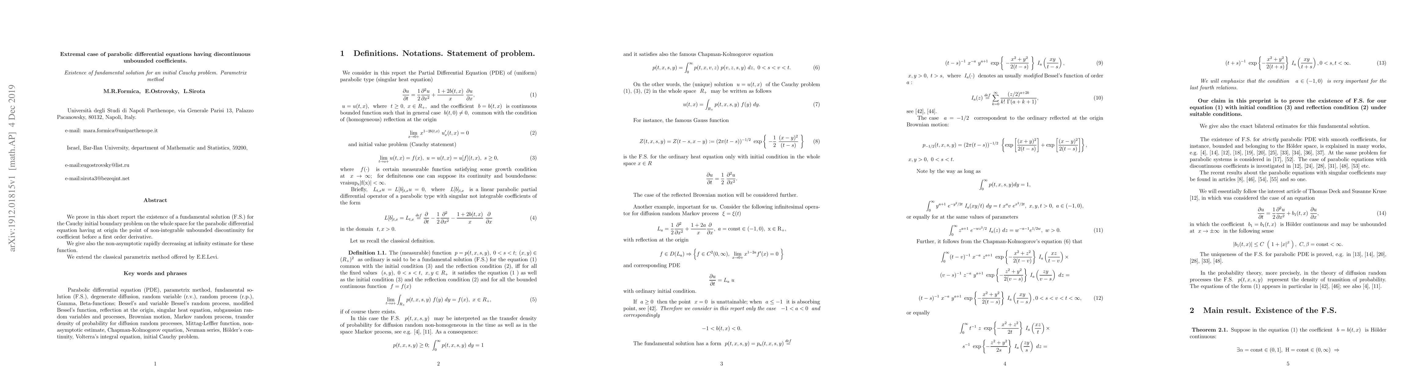 We prove in this short report the existence of a fundamental solution (F.S.) for the Cauchy initial boundary problem on the whole space for the parabolic differential equation having at origin the point of non-integrable unbounded discontinuity for coefficient before a first order derivative. We give also the non-asymptotic rapidly decreasing at infinity estimate for these function. We extend the classical parametrix method offered by E.E.Levi.