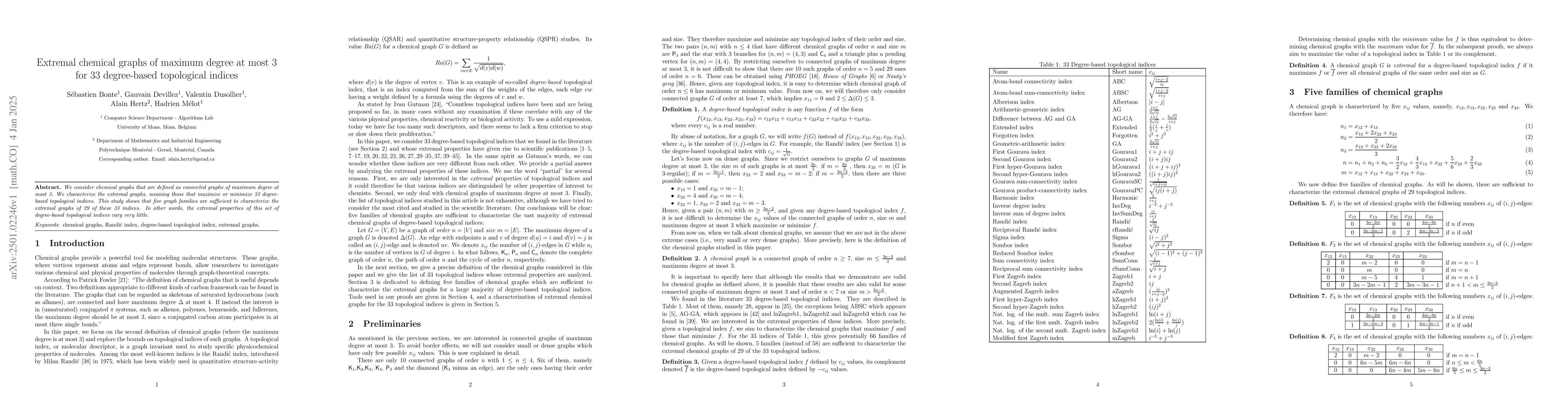 Summary: This study characterizes extremal chemical graphs with a maximum degree of 3 for 33 degree-based topological indices, finding that only five graph families are needed to describe the extremal graphs for 29 of these indices, indicating limited variability in extremal properties.