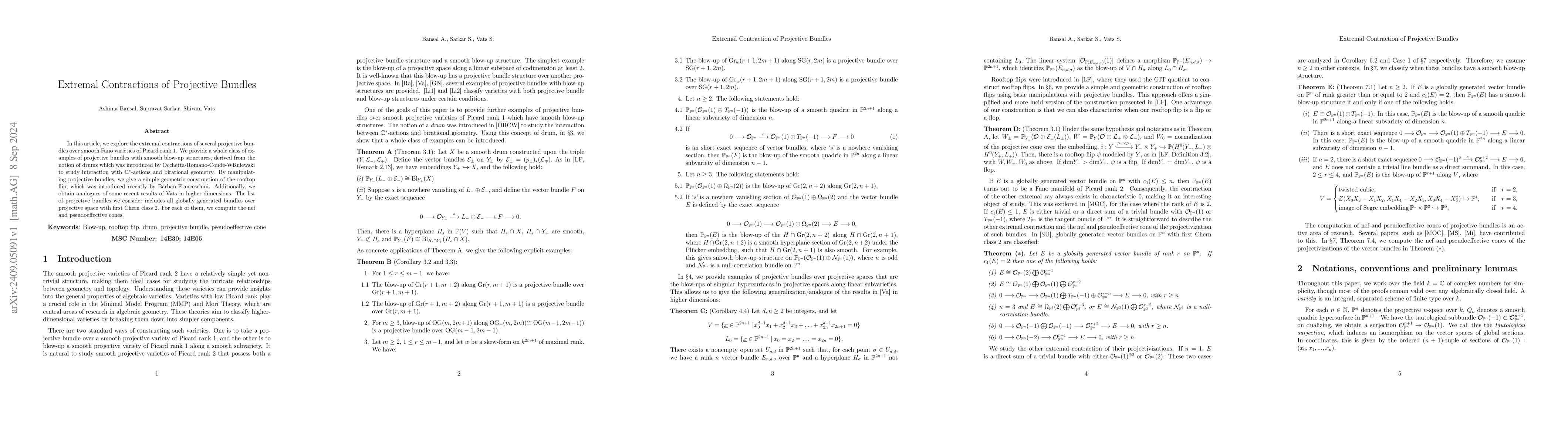 This paper investigates extremal contractions of projective bundles over smooth Fano varieties with Picard rank 1, providing examples of bundles with smooth blow-up structures. It introduces a geometric construction of the rooftop flip and computes nef and pseudoeffective cones for globally generated bundles over projective space with first Chern class 2.