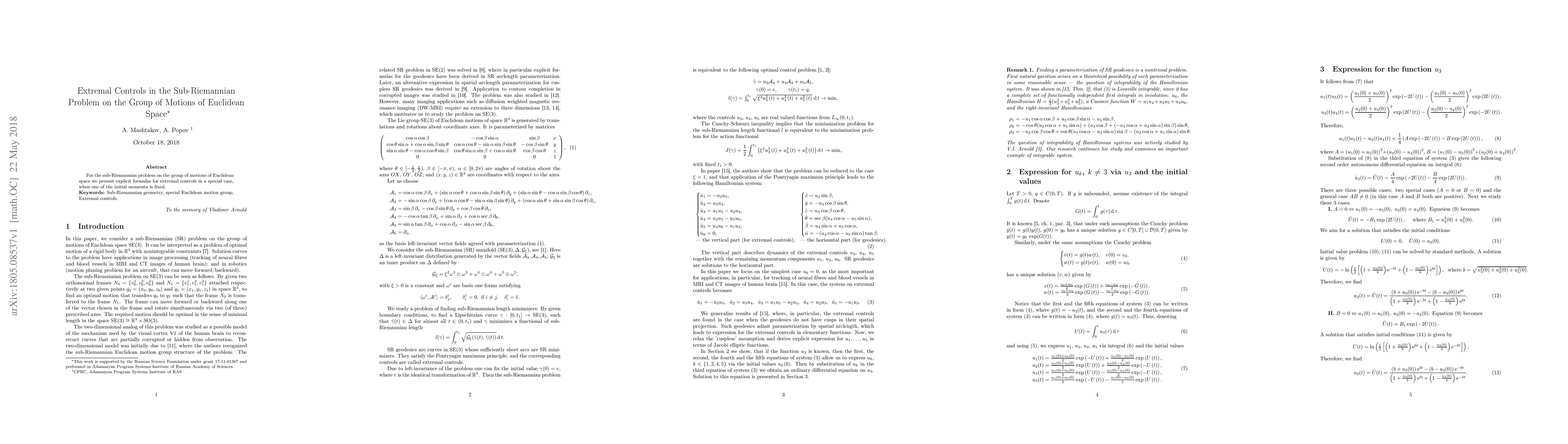 This paper provides explicit formulas for extremal controls in the sub-Riemannian problem on the group of motions of Euclidean space, focusing on a special case where one of the initial momenta is fixed. The results offer insights into optimal control strategies within this geometric framework.