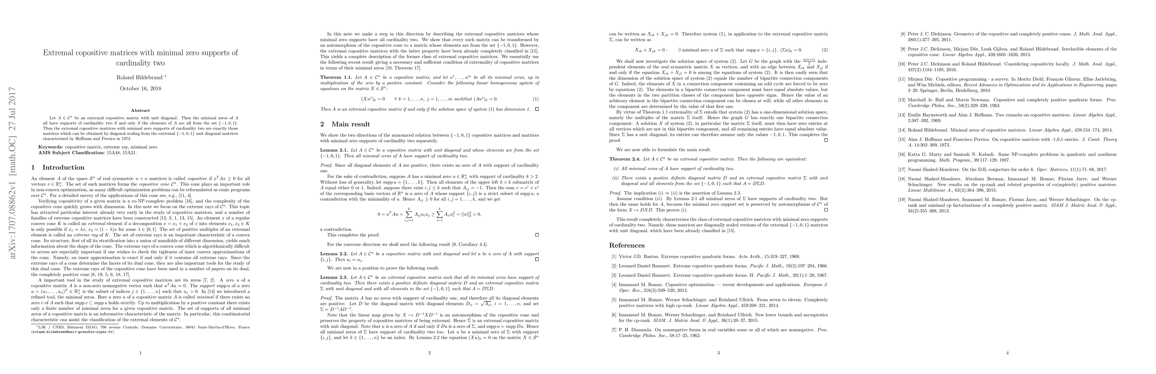 Let $A \in {\cal C}^n$ be an extremal copositive matrix with unit diagonal. Then the minimal zeros of $A$ all have supports of cardinality two if and only if the elements of $A$ are all from the set $\{-1,0,1\}$. Thus the extremal copositive matrices with minimal zero supports of cardinality two are exactly those matrices which can be obtained by diagonal scaling from the extremal $\{-1,0,1\}$ unit diagonal matrices characterized by Hoffman and Pereira in 1973.