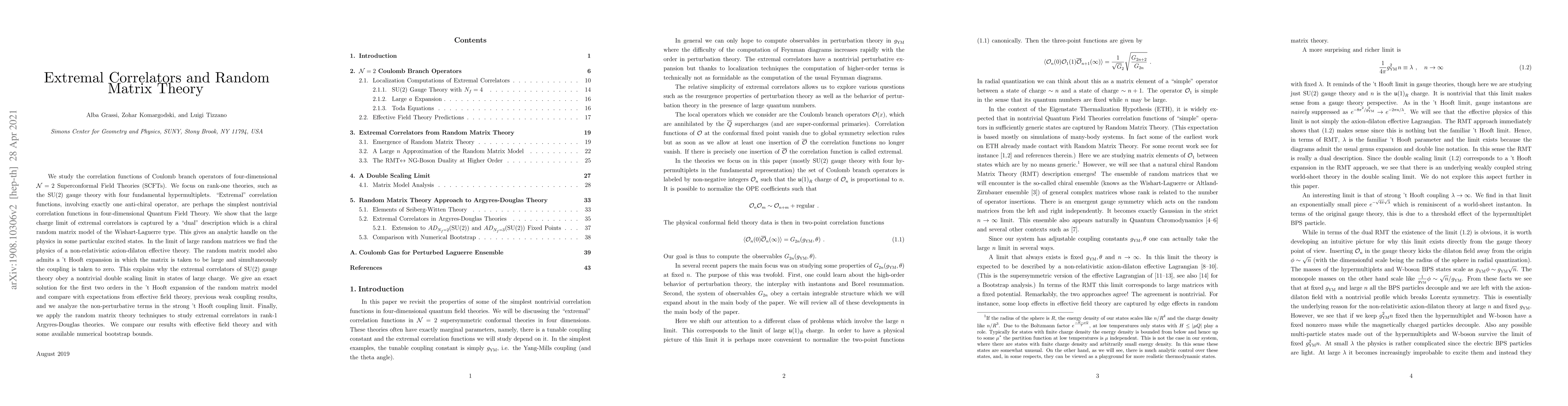 This paper investigates the correlation functions of Coulomb branch operators in four-dimensional $\mathcal{N} = 2$ SCFTs, particularly focusing on rank-one theories like SU(2) gauge theory. It demonstrates that extremal correlators in the large charge limit can be described by a chiral random matrix model, revealing insights into non-relativistic axion-dilaton effective theory and providing exact solutions for the first two orders in the 't Hooft expansion.