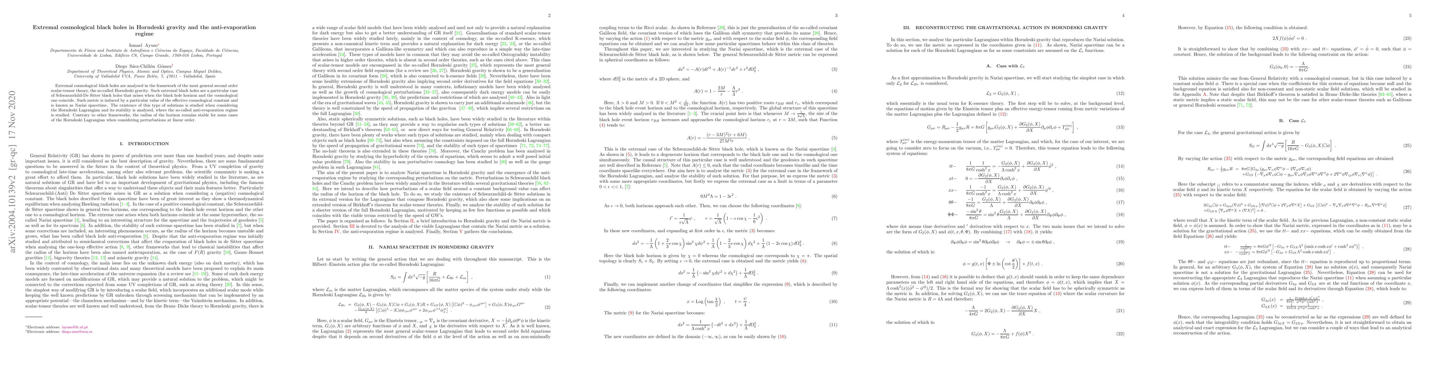 Extremal cosmological black holes are analysed in the framework of the most general second order scalar-tensor theory, the~so-called Horndeski gravity. Such~extremal black holes are a particular case of Schwarzschild-De Sitter black holes that arises when the black hole horizon and the cosmological one coincide. Such~metric is induced by a particular value of the effective cosmological constant and is known as Nariai spacetime. The~existence of this type of solutions is studied when considering the Horndeski Lagrangian and its stability is analysed, where the so-called anti-evaporation regime is studied. Contrary to other frameworks, the~radius of the horizon remains stable for some cases of the Horndeski Lagrangian when considering perturbations at linear order.