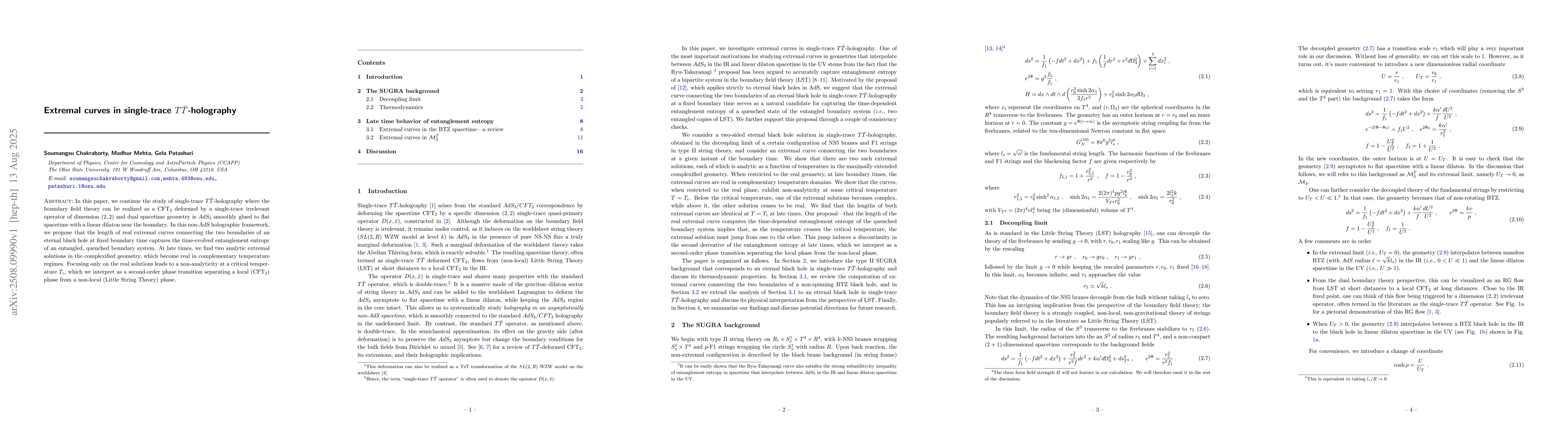 In this paper, we continue the study of single-trace $T\bar{T}$-holography where the boundary field theory can be realized as a CFT$_2$ deformed by a single-trace irrelevant operator of dimension $(2,2)$ and dual spacetime geometry is $AdS_3$ smoothly glued to flat spacetime with a linear dilaton near the boundary. In this non-AdS holographic framework, we propose that the length of real extremal curves connecting the two boundaries of an eternal black hole at fixed boundary time captures the time-evolved entanglement entropy of an entangled, quenched boundary system. At late times, we find two analytic extremal solutions in the complexified geometry, which become real in complementary temperature regimes. Focusing only on the real solutions leads to a non-analyticity at a critical temperature $T_c$, which we interpret as a second-order phase transition separating a local (CFT$_2$) phase from a non-local (Little String Theory) phase.
