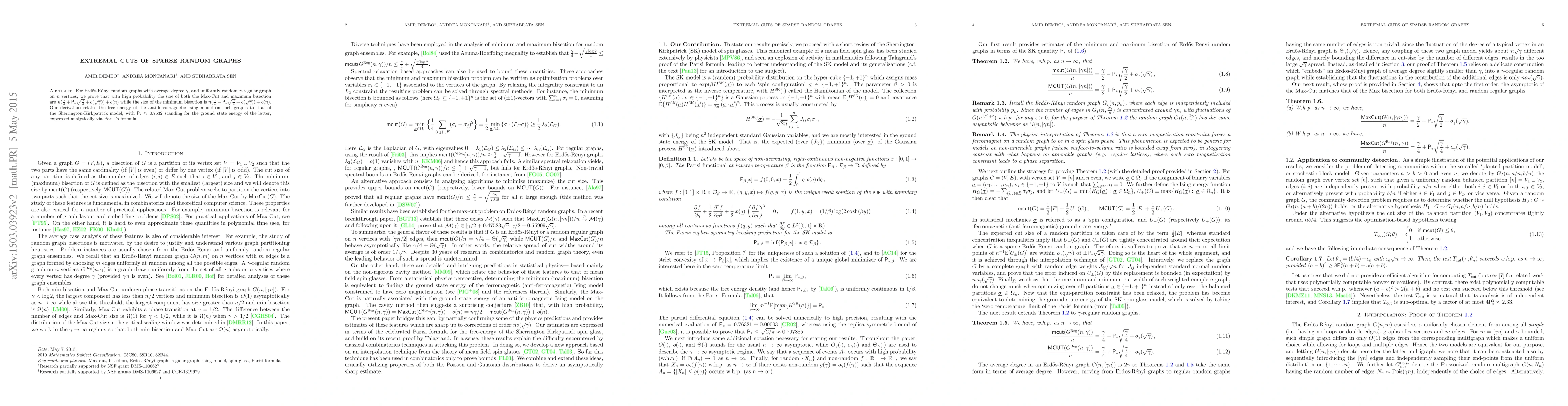 For Erd\H{o}s-R\'enyi random graphs with average degree $\gamma$, and uniformly random $\gamma$-regular graph on $n$ vertices, we prove that with high probability the size of both the Max-Cut and maximum bisection are $n\Big(\frac{\gamma}{4} + {{\sf P}}_* \sqrt{\frac{\gamma}{4}} + o(\sqrt{\gamma})\Big) + o(n)$ while the size of the minimum bisection is $n\Big(\frac{\gamma}{4}-{{\sf P}}_*\sqrt{\frac{\gamma}{4}} + o(\sqrt{\gamma})\Big) + o(n)$. Our derivation relates the free energy of the anti-ferromagnetic Ising model on such graphs to that of the Sherrington-Kirkpatrick model, with ${{\sf P}}_* \approx 0.7632$ standing for the ground state energy of the latter, expressed analytically via Parisi's formula.