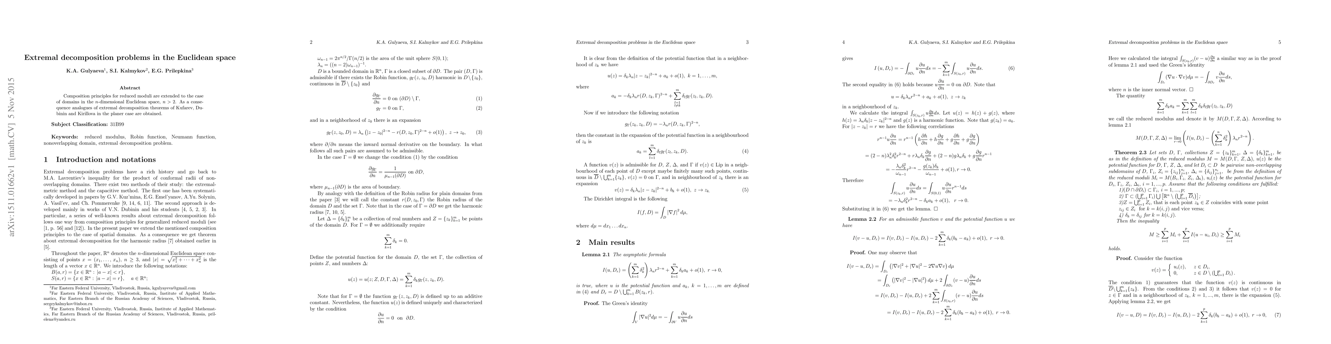 Composition principles for reduced moduli are extended to the case of domains in the $n$-dimensional Euclidean space, $n>2$. As a consequence analogues of extremal decomposition theorems of Kufarev, Dubinin and Kirillova in the planer case are obtained.