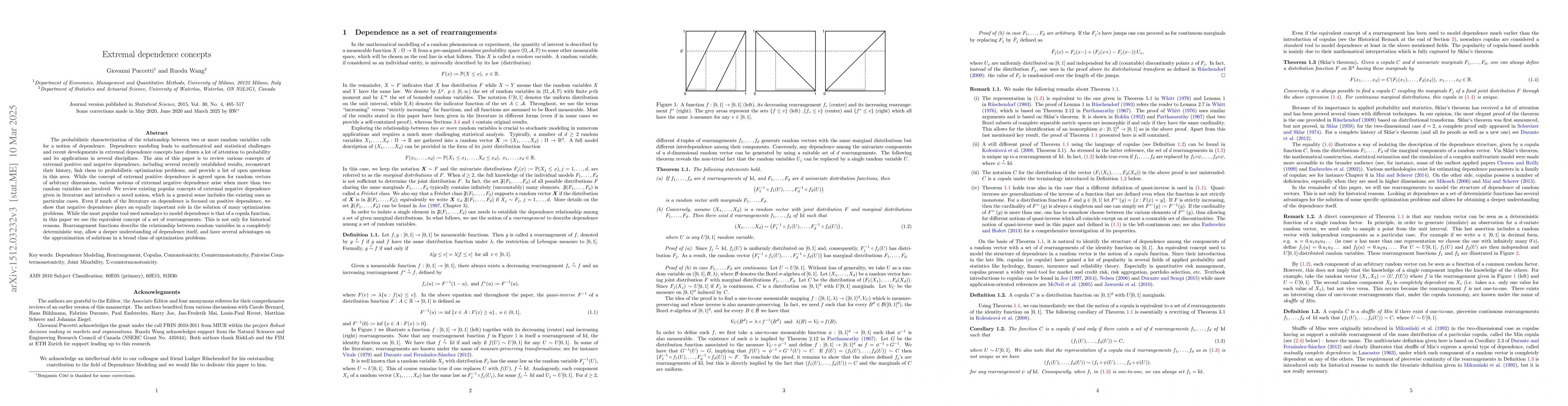 The probabilistic characterization of the relationship between two or more random variables calls for a notion of dependence. Dependence modeling leads to mathematical and statistical challenges, and recent developments in extremal dependence concepts have drawn a lot of attention to probability and its applications in several disciplines. The aim of this paper is to review various concepts of extremal positive and negative dependence, including several recently established results, reconstruct their history, link them to probabilistic optimization problems, and provide a list of open questions in this area. While the concept of extremal positive dependence is agreed upon for random vectors of arbitrary dimensions, various notions of extremal negative dependence arise when more than two random variables are involved. We review existing popular concepts of extremal negative dependence given in literature and introduce a novel notion, which in a general sense includes the existing ones as particular cases. Even if much of the literature on dependence is focused on positive dependence, we show that negative dependence plays an equally important role in the solution of many optimization problems. While the most popular tool used nowadays to model dependence is that of a copula function, in this paper we use the equivalent concept of a set of rearrangements. This is not only for historical reasons. Rearrangement functions describe the relationship between random variables in a completely deterministic way, allow a deeper understanding of dependence itself, and have several advantages on the approximation of solutions in a broad class of optimization problems.