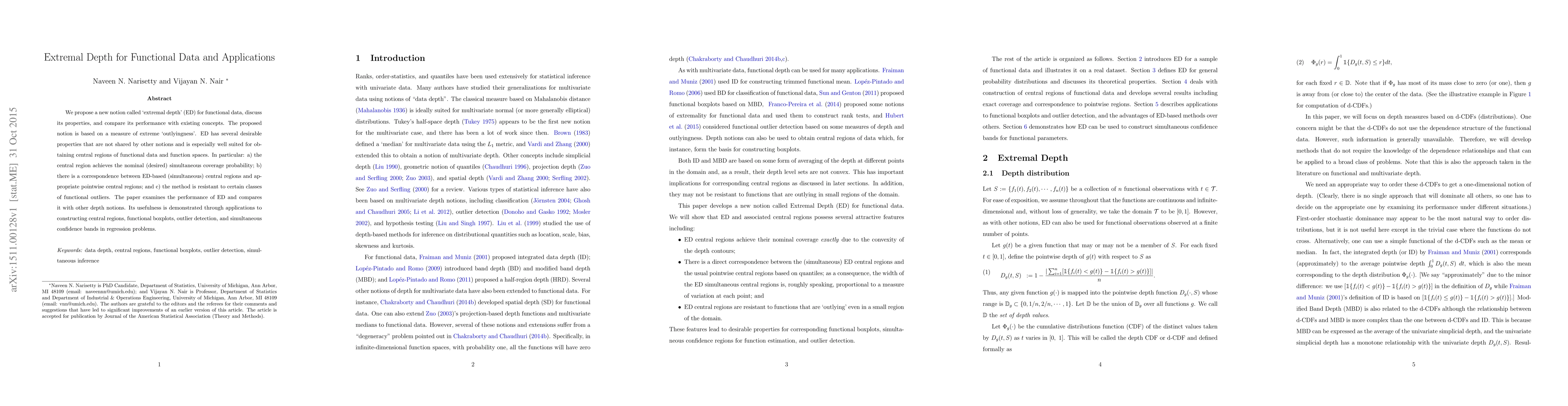 This paper introduces "extremal depth" (ED) as a new measure for functional data, highlighting its properties and comparing its performance against existing depth concepts. ED is particularly effective for identifying central regions in functional data, demonstrating robustness to outliers and achieving desired coverage probabilities.