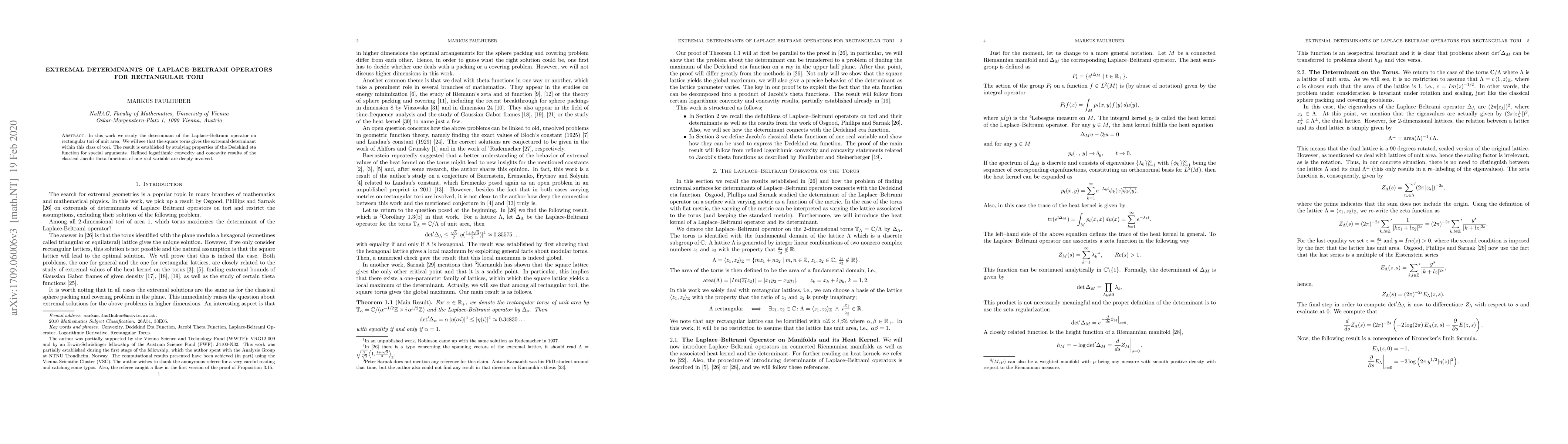 This paper investigates the determinant of the Laplace-Beltrami operator on rectangular tori with unit area, finding that the square torus has the extremal determinant. The study leverages properties of the Dedekind eta function and refined results on Jacobi theta functions.