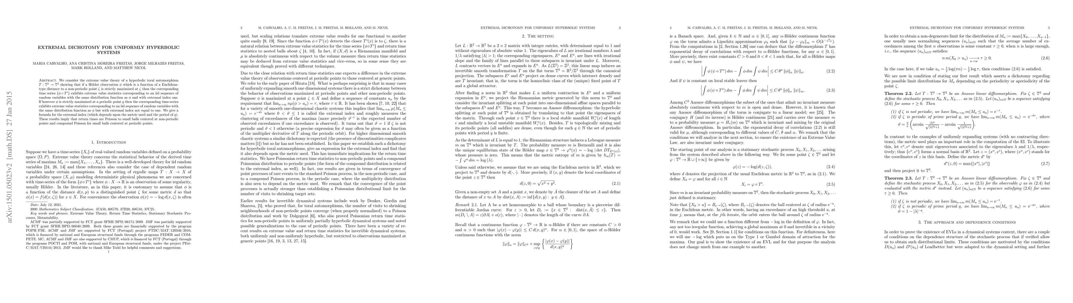 The paper shows that for uniformly hyperbolic systems, a function strictly maximized at a non-periodic point leads to extreme value statistics of iid random variables with extremal index one, while maximization at a periodic point results in statistics with an extremal index not equal to one.