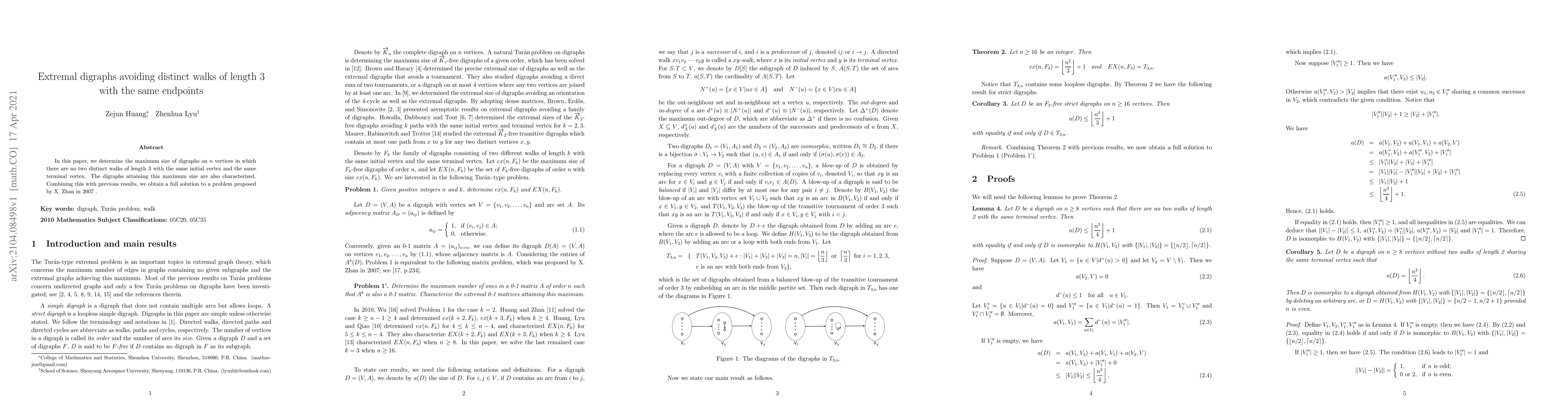 In this paper, we determine the maximum size of digraphs on $n$ vertices in which there are no two distinct walks of length $3$ with the same initial vertex and the same terminal vertex. The digraphs attaining this maximum size are also characterized. Combining this with previous results, we obtain a full solution to a problem proposed by X. Zhan in 2007.