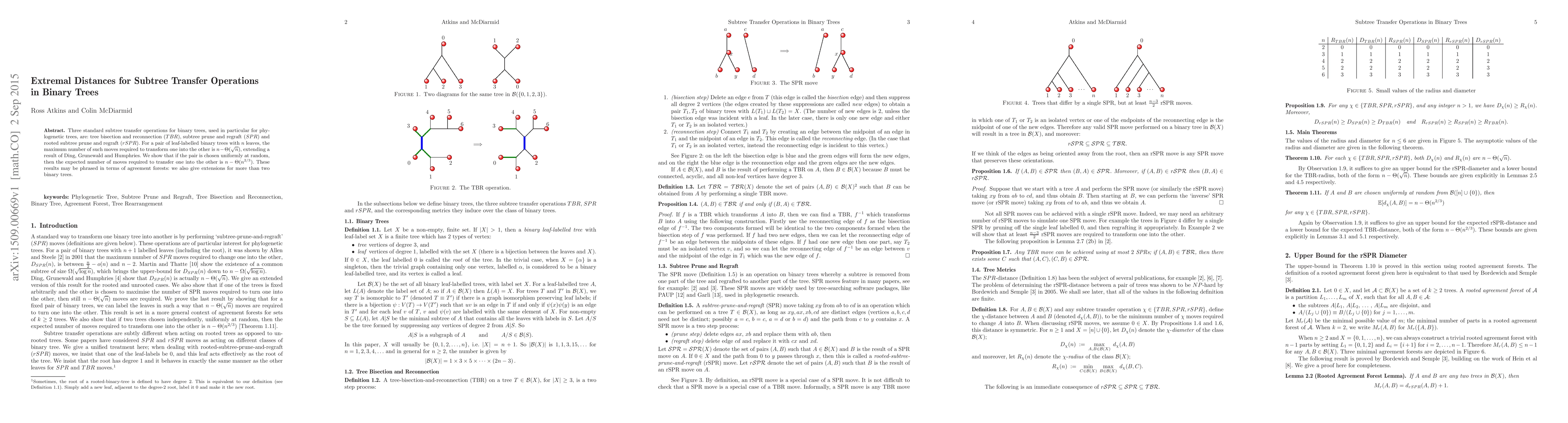 This paper investigates the extremal distances for three key subtree transfer operations in binary trees, specifically $TBR$, $SPR$, and $rSPR$, and finds that transforming one leaf-labelled binary tree into another requires $n-\Theta(\sqrt{n})$ moves, with a probabilistic variant showing an expected number of $n-\Theta(n^{2/3})$ moves for randomly chosen trees.