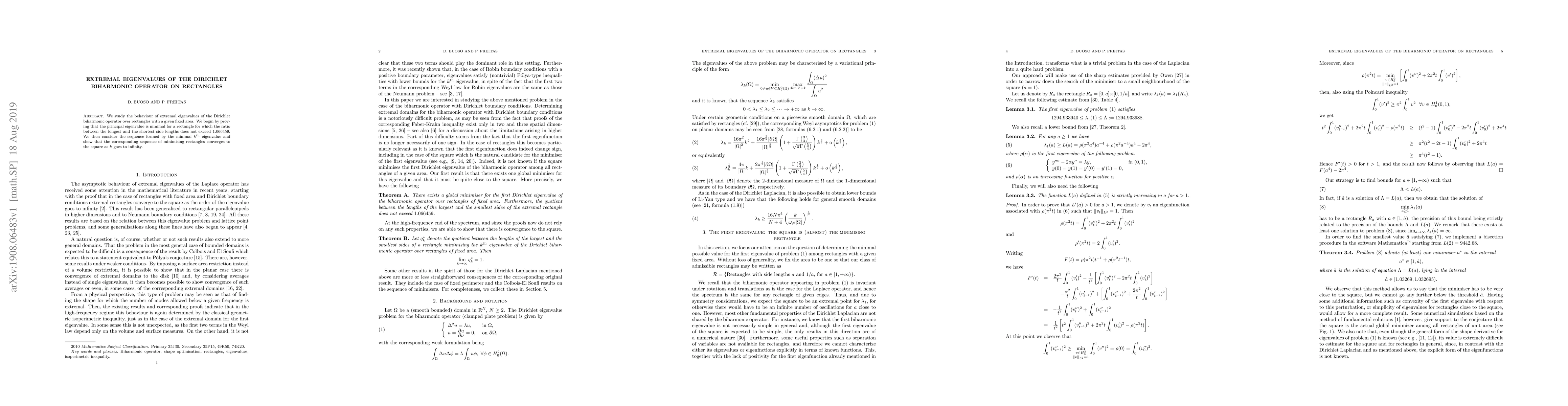 This study investigates the extremal eigenvalues of the Dirichlet biharmonic operator on rectangles with a fixed area, proving that the principal eigenvalue is minimized when the rectangle's side length ratio does not exceed 1.066459. It further shows that as the sequence of minimal $k^{\rm th}$ eigenvalues increases, the corresponding minimizing rectangles converge to a square.