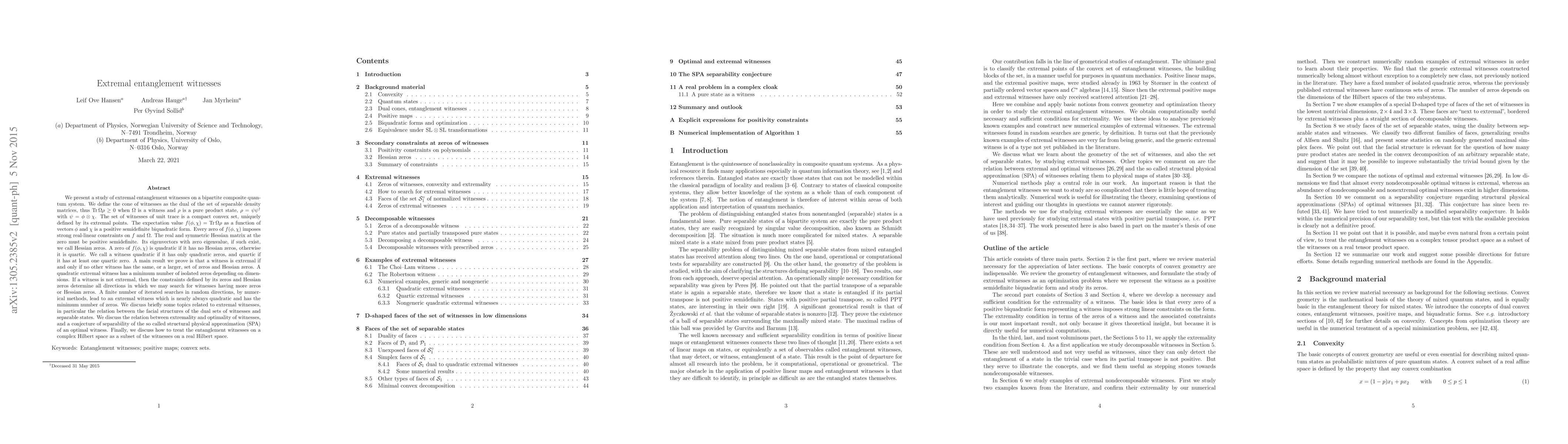 We study extremal entanglement witnesses on a bipartite quantum system. We define the cone of witnesses as the dual of the set of separable density matrices, thus $\textrm{Tr}\,\Omega\rho\geq 0$ when $\Omega$ is a witness and $\rho$ a pure product state, $\rho=\psi\psi^{\dagger}$ with $\psi=\phi\otimes\chi$. The set of witnesses of unit trace is a compact convex set, defined by its extremal points. The expectation value $f(\phi,\chi)=\mathrm{Tr}\,\Omega\rho$ as a function of $\phi$ and $\chi$ is a nonnegative biquadratic form. Every zero of $f(\phi,\chi)$ imposes real-linear constraints on $f$ and $\Omega$. The Hessian matrix at the zero must be nonnegative. Its eigenvectors with zero eigenvalue, if any, we call Hessian zeros. A zero of $f(\phi,\chi)$ is quadratic if it has no Hessian zeros, otherwise it is quartic. We call a witness quadratic if it has only quadratic zeros, and quartic otherwise. We prove that a witness is extremal if and only if no other witness has the same, or a larger, set of zeros and Hessian zeros. A quadratic extremal witness has a minimum number of isolated zeros depending on dimensions. If a witness is not extremal, the constraints defined by its zeros and Hessian zeros determine all directions in which to search for witnesses having more zeros or Hessian zeros. A finite number of iterated searches in random directions lead to an extremal witness which is usually quadratic with the minimum number of zeros. We discuss some topics related to extremal witnesses, in particular the relation between the facial structures of the dual sets of witnesses and separable states. We discuss the relation between extremality and optimality of witnesses, and a conjecture of separability of the structural physical approximation (SPA) of an optimal witness. We discuss how to treat the entanglement witnesses on a complex Hilbert space as witnesses on a real Hilbert space.