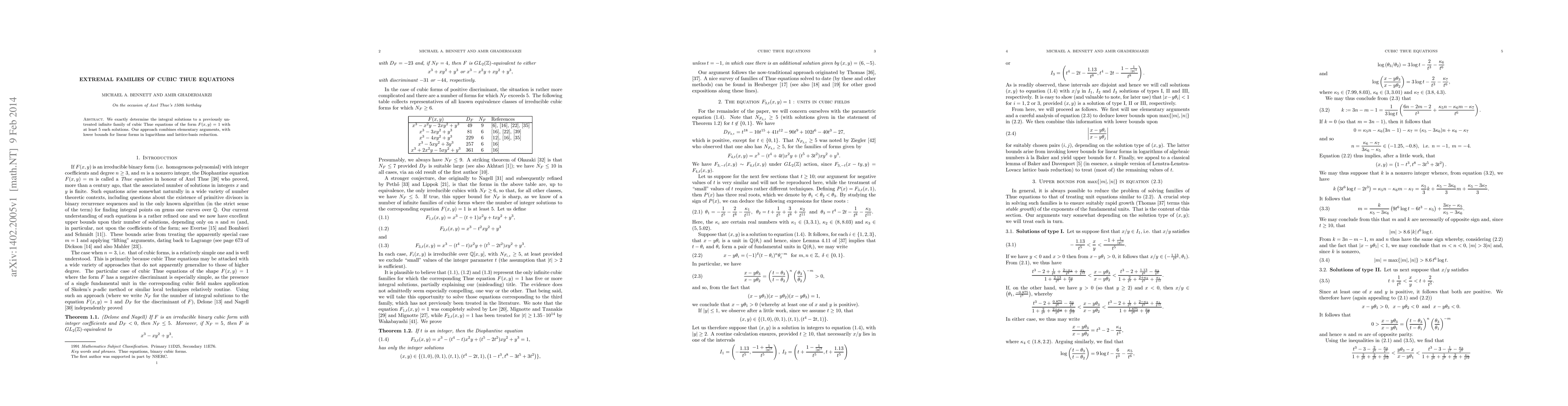 This paper identifies all integral solutions for a new infinite family of cubic Thue equations $F(x,y)=1$ with at least five solutions, employing a mix of elementary methods and advanced techniques like lower bounds for linear forms in logarithms and lattice-basis reduction.