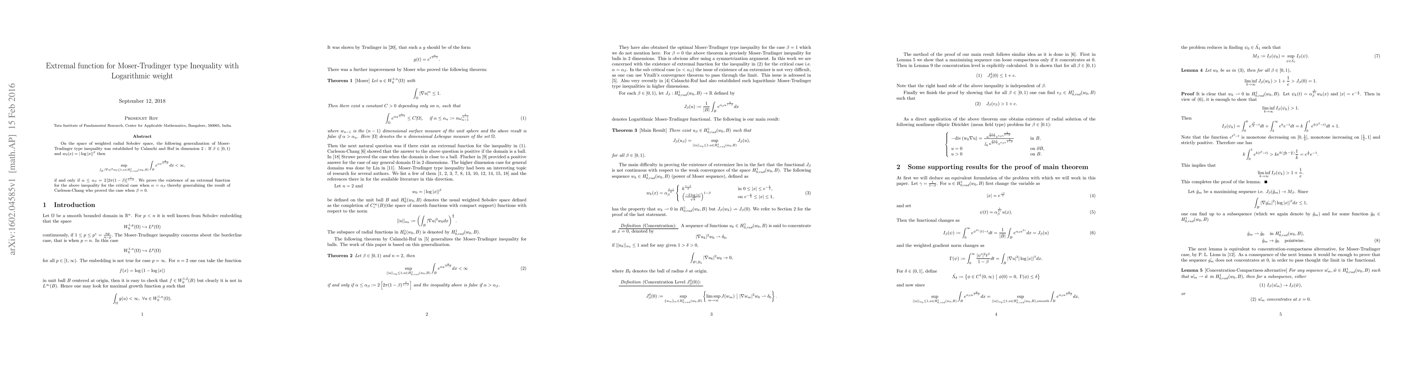 On the space of weighted radial Sobolev space, the following generalization of Moser-Trudinger type inequality was established by Calanchi and Ruf in dimension 2 : If $\beta \in [0,1)$ and $w_0(x) = |\log |x||^\beta $ then $$ \sup_{\int_B |\grad u|^2w_0 \leq 1 , u \in H_{0,rad}^1(w_0,B)} \int_B e^{\alpha u^{\frac{2}{1-\beta}}} dx < \infty,$$ if and only if $\alpha \leq \alpha_\beta = 2\left[2\pi (1-\beta) \right]^{\frac{1}{1-\beta}}.$ We prove the existence of an extremal function for the above inequality for the critical case when $\alpha = \alpha_\beta$ thereby generalizing the result of Carleson-Chang who proved the case when $\beta =0$.