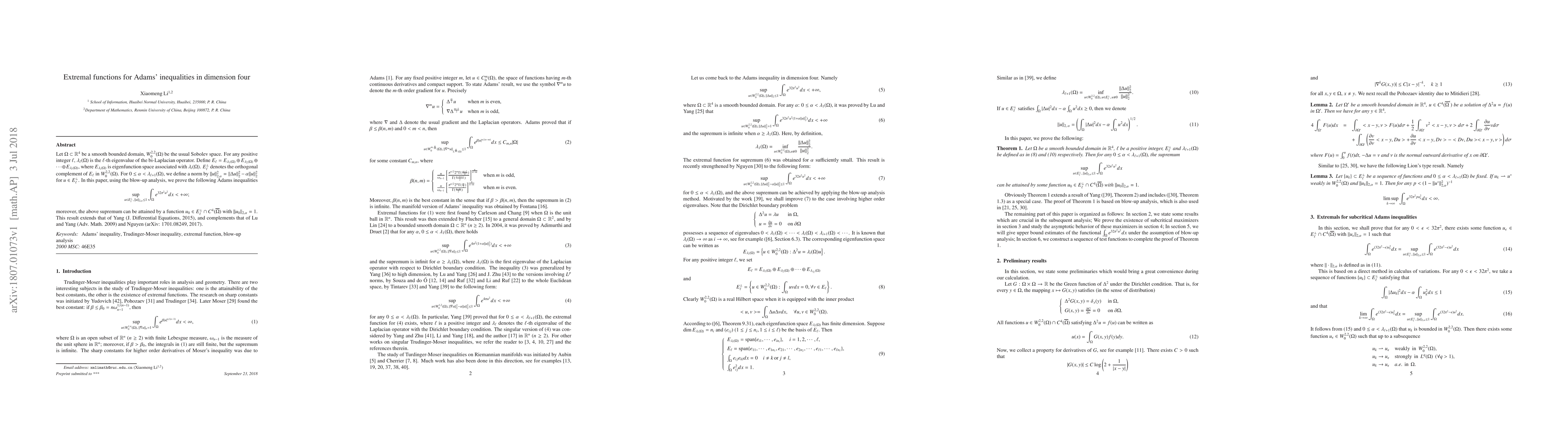Let $\Omega\subset \mathbb{R}^4$ be a smooth bounded domain, $W_0^{2,2}(\Omega)$ be the usual Sobolev space. For any positive integer $\ell$, $\lambda_{\ell}(\Omega)$ is the $\ell$-th eigenvalue of the bi-Laplacian operator. Define $E_{\ell}=E_{\lambda_1(\Omega)}\oplus E_{\lambda_2(\Omega)}\oplus\cdots\oplus E_{\lambda_{\ell}(\Omega)}$, where $E_{\lambda_i(\Omega)}$ is eigenfunction space associated with $\lambda_i(\Omega)$. $E^{\bot}_{\ell}$ denotes the orthogonal complement of $E_\ell$ in $W_0^{2,2}(\Omega)$. For $0\leq\alpha<\lambda_{\ell+1}(\Omega)$, we define a norm by $\|u\|_{2,\alpha}^{2}=\|\Delta u\|^2_2-\alpha \|u\|^2_2$ for $u\in E^\bot_{\ell}$. In this paper, using the blow-up analysis, we prove the following Adams inequalities $$\sup_{u\in E_{\ell}^{\bot},\,\| u\|_{2,\alpha}\leq 1}\int_{\Omega}e^{32\pi^2u^2}dx<+\infty;$$ moreover, the above supremum can be attained by a function $u_0\in E_{\ell}^{\bot}\cap C^4(\overline{\Omega})$ with $\|u_0\|_{2,\alpha}=1$. This result extends that of Yang (J. Differential Equations, 2015), and complements that of Lu and Yang (Adv. Math. 2009) and Nguyen (arXiv: 1701.08249, 2017).