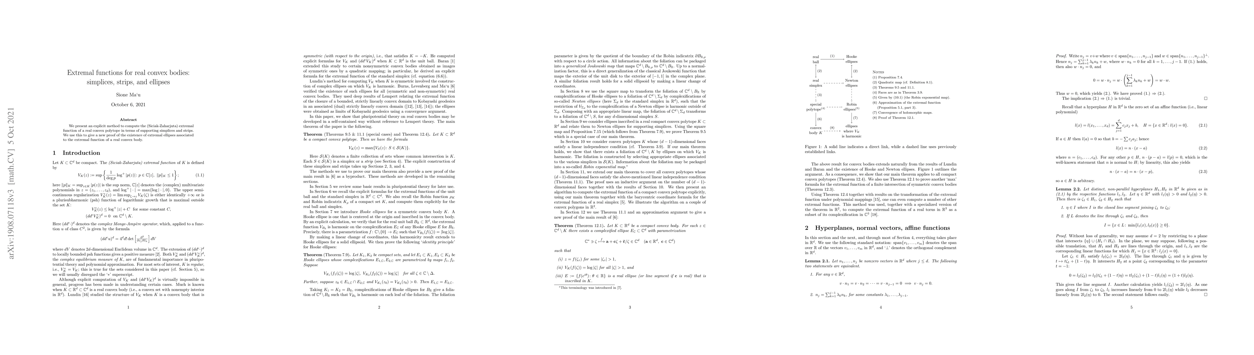 Summary: This paper provides an explicit method to compute extremal functions for real convex polytopes using simplices and strips, and uses this to offer a new proof for the existence of extremal ellipses linked to these functions.