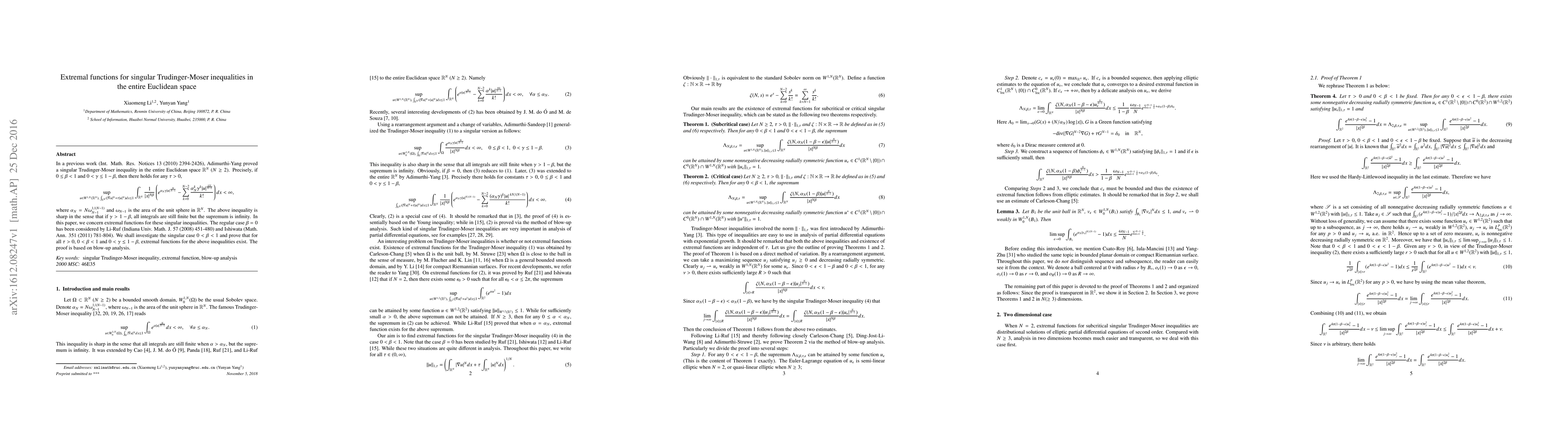 This paper investigates extremal functions for singular Trudinger-Moser inequalities in $\mathbb{R}^N$ by Adimurthi-Yang. It proves the existence of extremal functions for the singular case when $0<\beta<1$ and $0<\gamma\leq 1-\beta$, employing blow-up analysis.