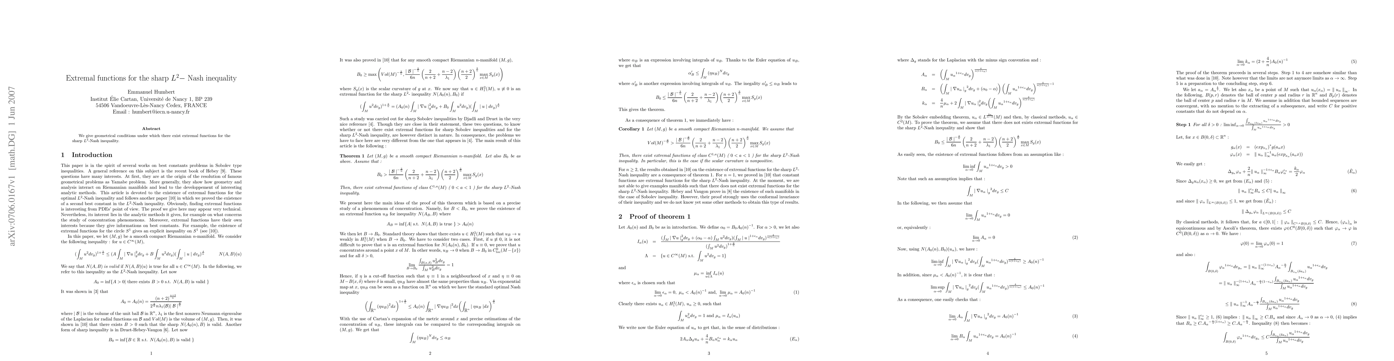 We give geometrical conditions under which there exist extremal functions for the sharp $L^2$-Nash inequality.